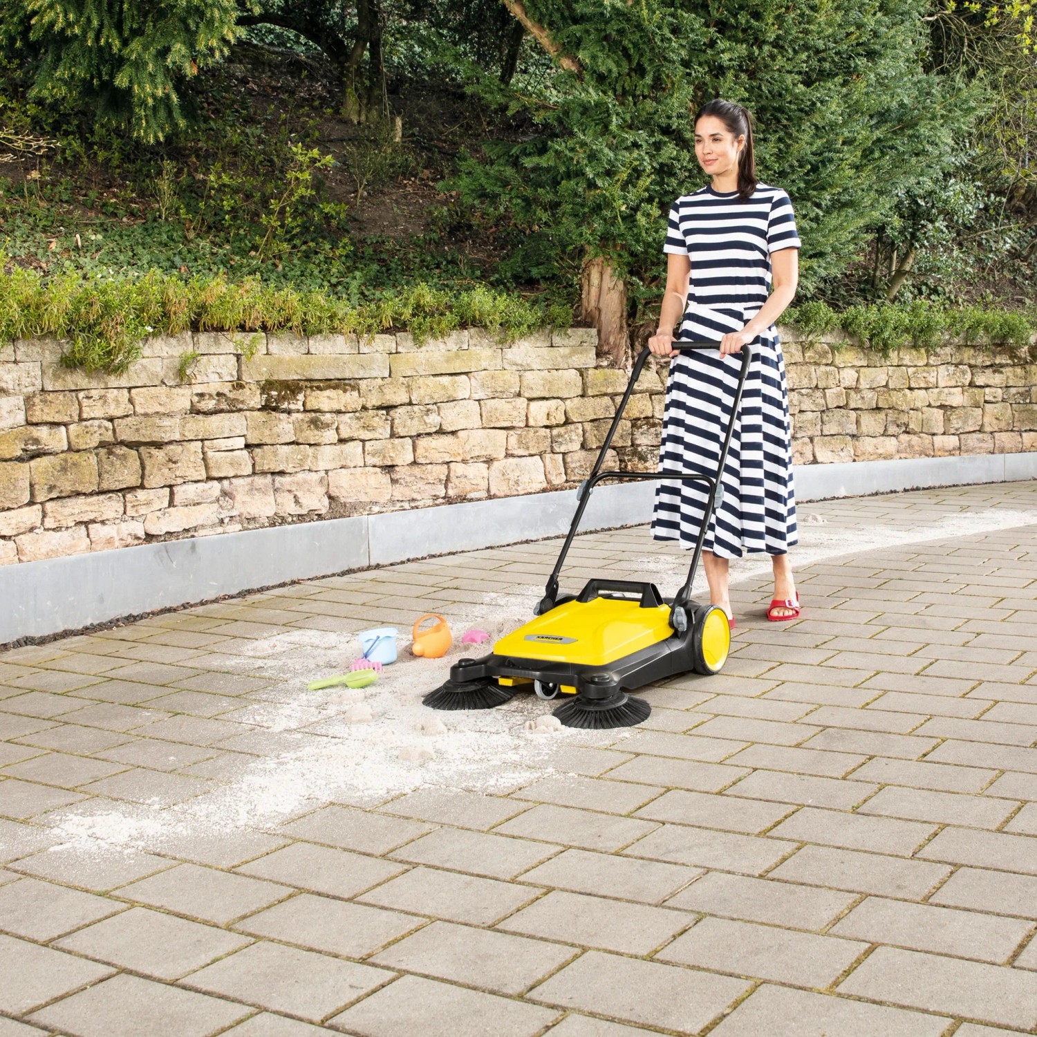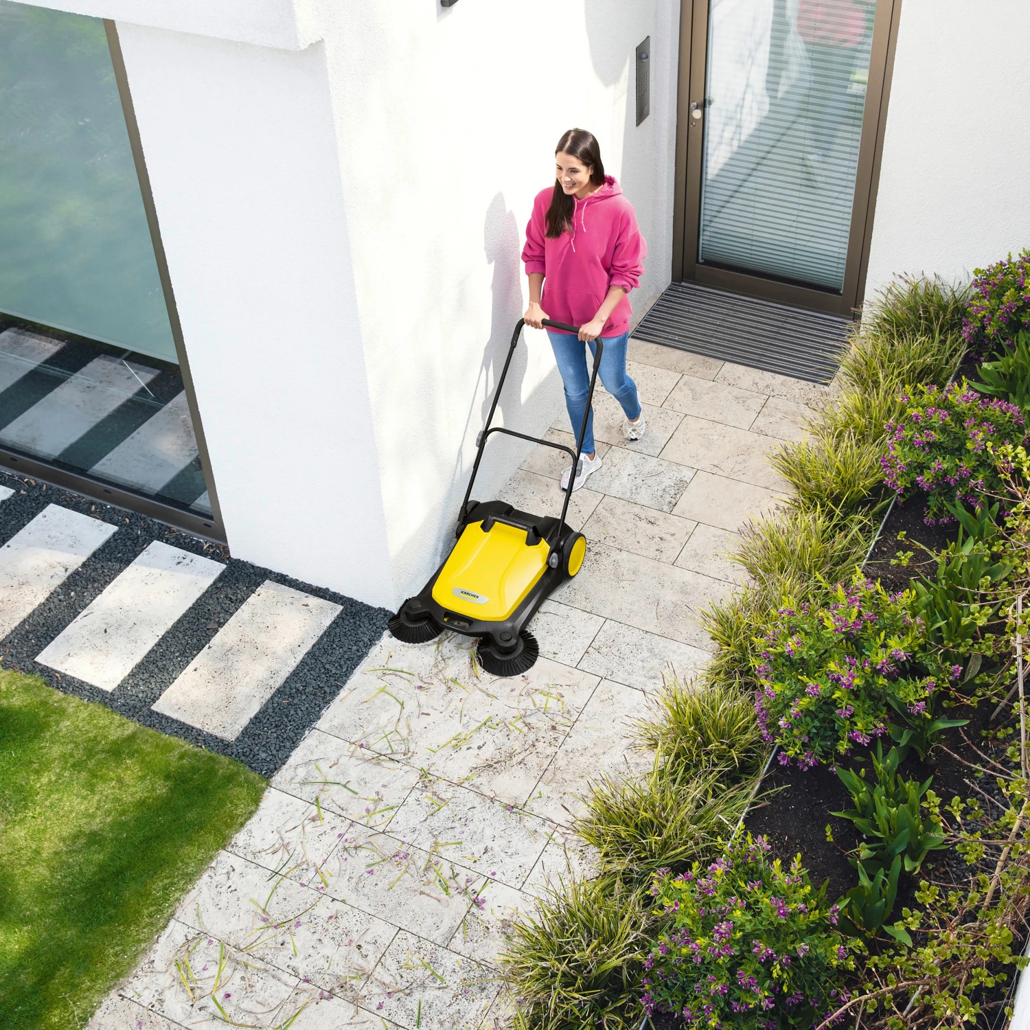 Ob Blütenblätter im Frühling, Sand im Sommer, Laub im Herbst oder Streugut im Winter: Mit der effektiven und ergonomischen Kärcher Kehrmaschine S 4 Twin haben Sie ganzjährig glanzvolle Zeiten rund um Haus und Garten. Mit ihrer kräftigen Kehrwalze, ihren 2 Seitenbesen und einer Kehrbreite von insgesamt 68 cm kehrt sie mühelos und schnell Flächen von bis zu 2'400 m2/h. Das Kehrgut gelangt direkt in den zugehörigen Kehrbehälter, welcher sich ganz einfach abnehmen und entleeren lässt. Den stufenlos höhenverstellbaren Schubbügel können Sie Ihrer Körpergrösse anpassen. Die Kehrmaschine kann bei Bedarf ohne Bücken ganz einfach durch Betätigung einer Trittfläche am Rahmen komplett umgeklappt und am Handgriff getragen werden. So kann sie auch platzsparend aufbewahrt werden. Einzigartig ist die werkzeuglose Seitenbesenanbringung, womit diese Kehrmaschine schnell einsatzbereit ist.