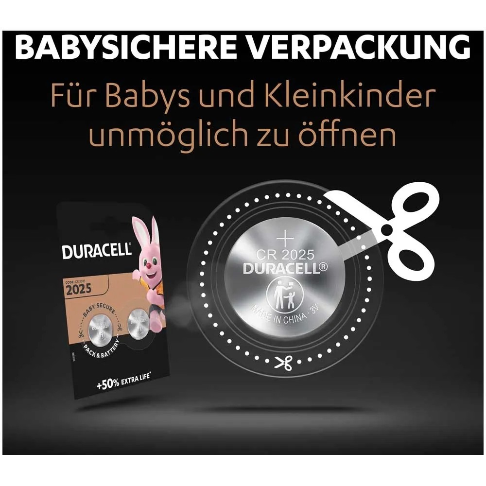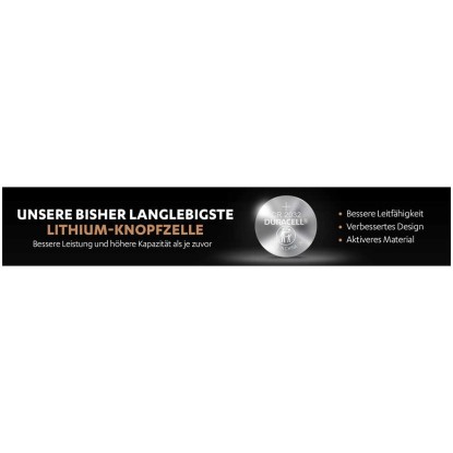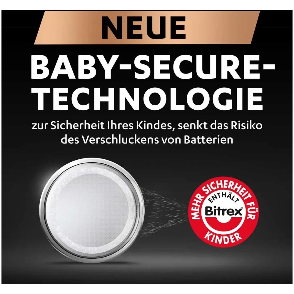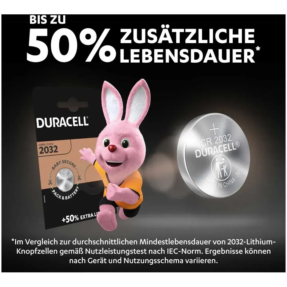 Duracell Knopfzellen der Grösse CR2032 bestehen aus hochreinem Lithium mit bis zu 50 % mehr Leistung für Ihre Spezialgeräte (im Vergleich zur durchschnittlichen Mindestlebensdauer von CR2032, CR2025 und CR2016 Lithium-Knopfzellen gemäss Nutzleistungstest nach IEC-Norm. Ergebnisse können nach Gerät und Nutzungsschema variieren.) Sie haben eine Lagergarantie von bis zu 10 Jahren, daher können Sie darauf vertrauen, dass diese Lithium-Knopfzellen einsatzbereit sind, wenn Sie sie brauchen. Um die Sicherheit Ihrer Kinder zu gewährleisten und ein etwaiges Verschlucken der Batterien zu verhindern, hat Duracell eine kindersichere Technologie entwickelt: eine Schicht auf der Rückseite der Batterie, die bitter schmeckt. Ausserdem hat Duracell eine kindersichere Verpackung mit Doppelblister entworfen, die von Kindern nicht ohne eine Schere geöffnet werden kann. Die Lithium-Knopfzellen sind gemacht für die Verwendung in Schlüsselanhängern, kleinen Fernbedienungen, Waagen, Wearables, Sensoren, medizinischen Geräten (Blutzuckermessgeräte, Digitalthermometer) und Sportgeräten (Pulsmesser, Fahrradzubehör).