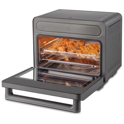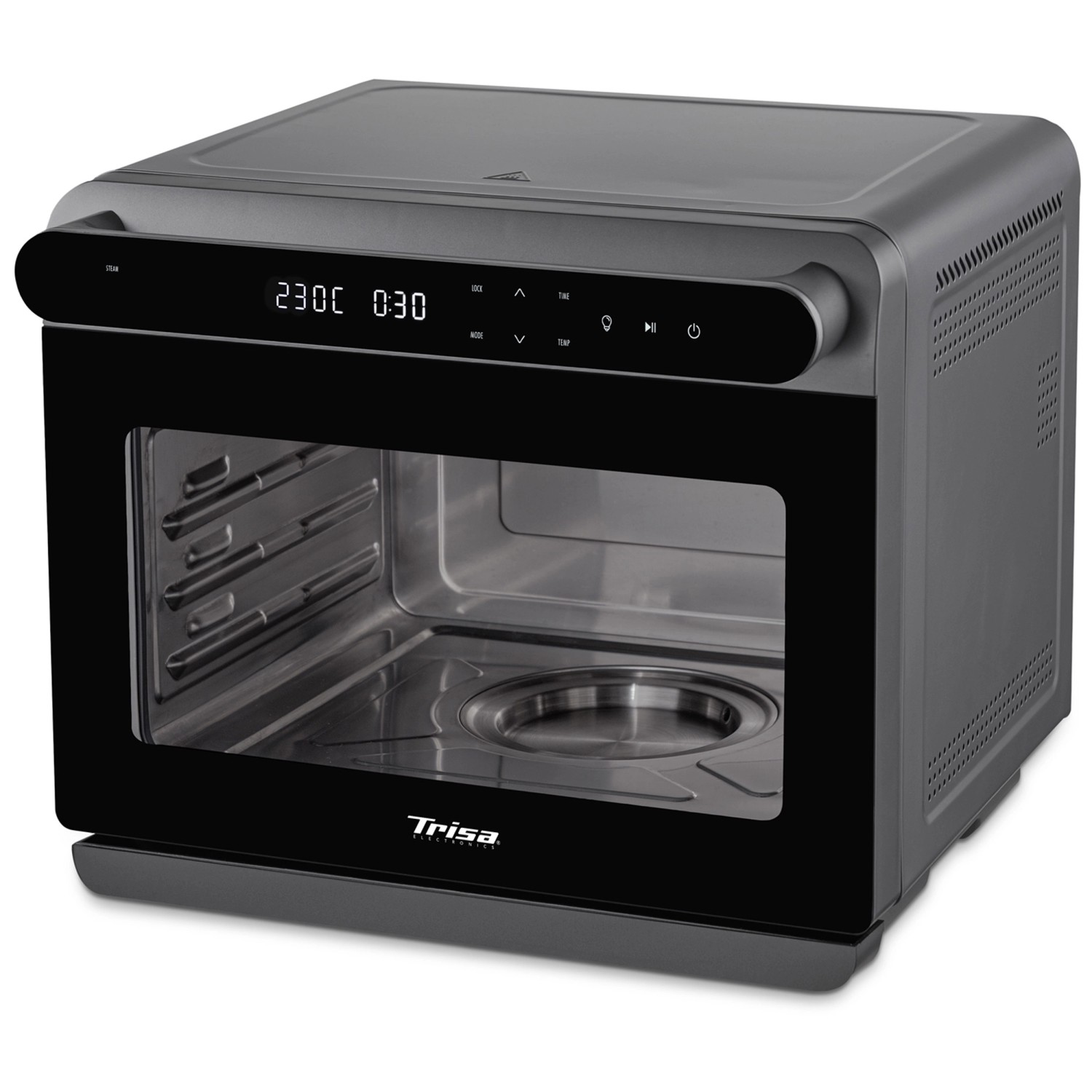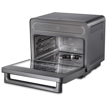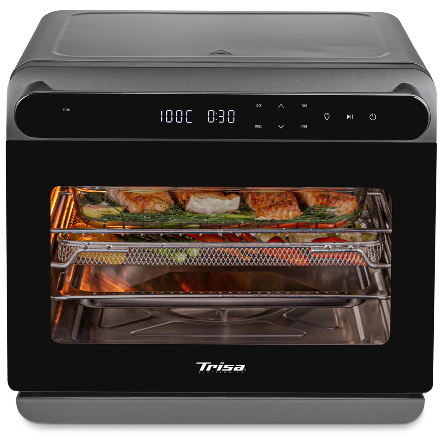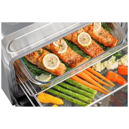 Der Trisa Electronics Air Fusion Pro kombiniert Dampf- und Heissluftfunktion in einem leistungsstarken Kompaktgerät und ermöglicht so eine besonders vielseitige Essenszubereitung. Dank acht Automatikprogrammen wie Steam, Rapid Steam, Air Fry, Bake, Vapor Bake, Drying, Fermenting und Keep Warm gelingen verschiedenste Gerichte einfach und zuverlässig. Der Wasserbehälter mit einem Fassungsvermögen von 1 l ermöglicht einen konstanten Dampfausstoss für besonders schonendes Garen. Die Bedienung erfolgt über ein intuitiv beleuchtetes LED-Display in der Griffleiste, das die einfache Auswahl von Menü, Temperatur und Zeit im Bereich von +30 bis +230 °C erlaubt. Der geräumige und hygienische Edelstahl-Garraum mit Beleuchtung sowie das spülmaschinenfeste Zubehör wie Gitterrost, Backblech und Lochblech sorgen für Komfort und eine einfache Reinigung. Mit einer Kapazität von 24 l und 1'600 W Leistung eignet sich das Kombigerät optimal für die Nutzung im Alltag sowie für zahlreiche kulinarische Anwendungen in der modernen Küche.