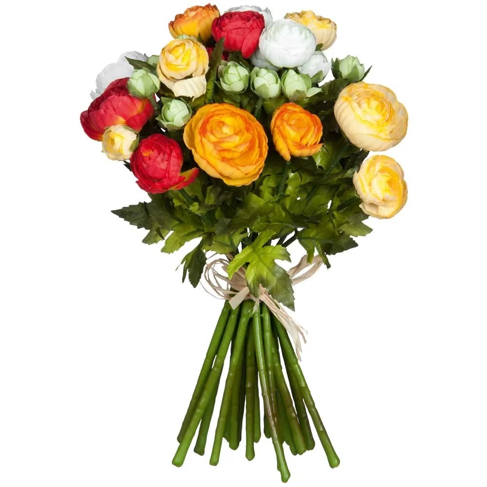 Der Ranunculus wird auch Hahnenfuss genannt. Mit dem leuchtend orangefarbenen Kunstblumenstrauss von Mica Decorations verschenken Sie Freude. Aufgrund der hochwertigen Verarbeitung und der naturgetreuen Farben sind die Ranunkeln kaum von echten Blumen zu unterscheiden, bieten aber alle Vorteile einer Kunstblume. Sie benötigen keine Pflege und blühen das ganze Jahr über. Da die Blumen aneinander befestigt sind, können Sie den Strauss einfach in eine schöne Vase stellen.