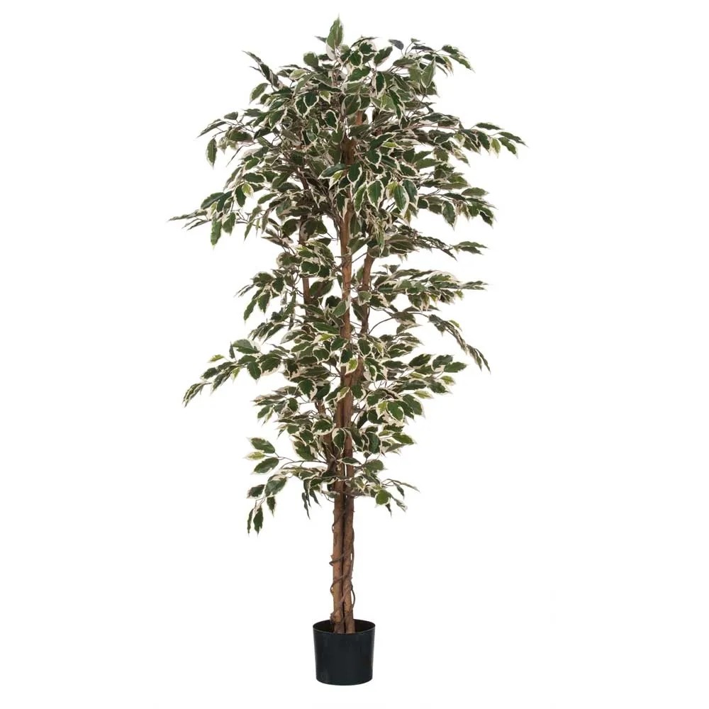 Die Kunstpflanzen von Mica Decorations für den Innenbereich sind von echten Pflanzen nicht zu unterscheiden, benötigen aber keinerlei Pflege. Mit dieser Birkenfeige holen Sie sich zudem sofort mehr Grün in Ihr Haus. Die frischen, verspielten Blättchen sind mit einer detailgetreu nachgebildeten Zeichnung mit hellen Rändern versehen. Da die Blätter in verschiedenen Grössen und Grüntönen ausgeführt werden, sieht die Pflanze wie echt aus, besonders in Kombination mit dem Holzstamm. Die Kunstpflanze ist in einem schwarzen Kunststoff-Topf fest verankert, muss aber vor dem Einsatz noch modelliert werden. Stellen Sie sie nach dem Entfalten so hin oder verleihen Sie ihr durch einen dekorativen Übertopf eine individuelle Note. Der Ficus lässt sich ideal mit anderen Kunstpflanzen und -blumen aus der Kollektion kombinieren. Im entfalteten Zustand ist die Pflanze ca. 180 cm hoch und hat einen Durchmesser von ca. 90 cm.