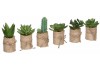 Die Sukkulenten sind in sechs verschiedenen Ausführungen erhältlich und stehen in einem kleinen Topf, der von einem Jutesack umhüllt ist.