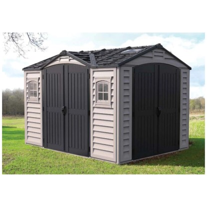Das Duramax Kunststoff-Gerätehaus beinhaltet einen Bodenrahmen, zwei grosse Türen mit doppelter Öffnung und Türgriffen mit Ösen für Vorhängeschlösser. Die Wandsäulen sind aus Metall verstärkt und verleihen Stabilität. Für eine lange Haltbarkeit wurde eines der härtesten und wetterbeständigsten Vinylharze verwendet.
