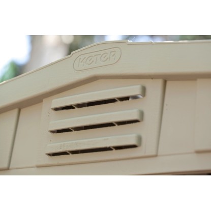 Ideal für die Aufbewahrung von Werkzeugen mit langen Stielen, Leitern, Gartenmöbeln und Grillgerätschaften. Das Kunststoffgerätehaus in Holzoptik ist mit einer Bodenplatte und einem Regalhalter ausgestattet. Durch die Öffnung am Dachfirst wird das Gerätehaus stets belüftet.