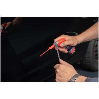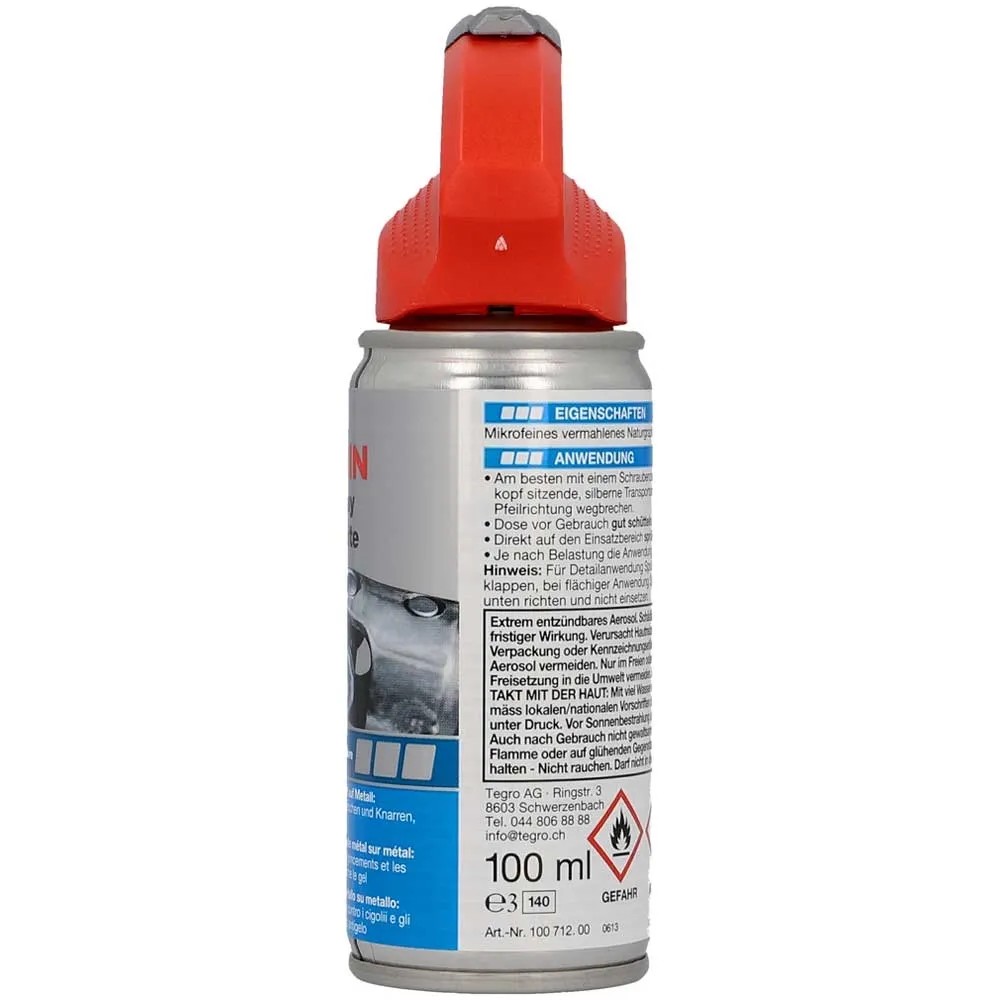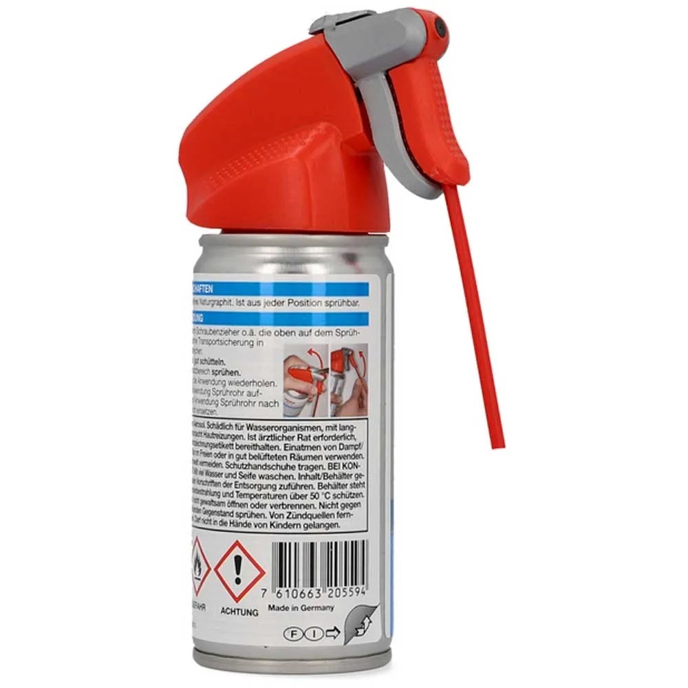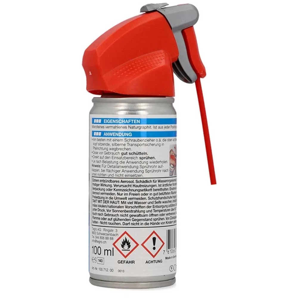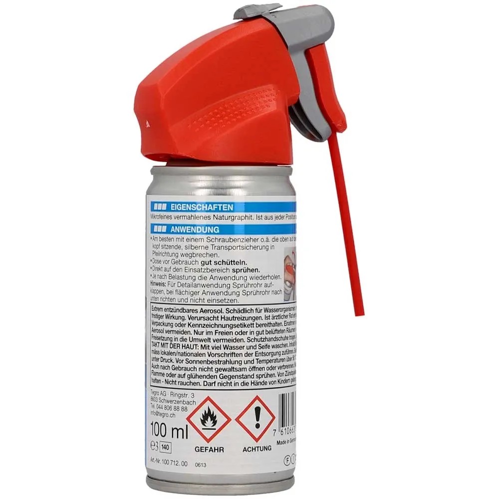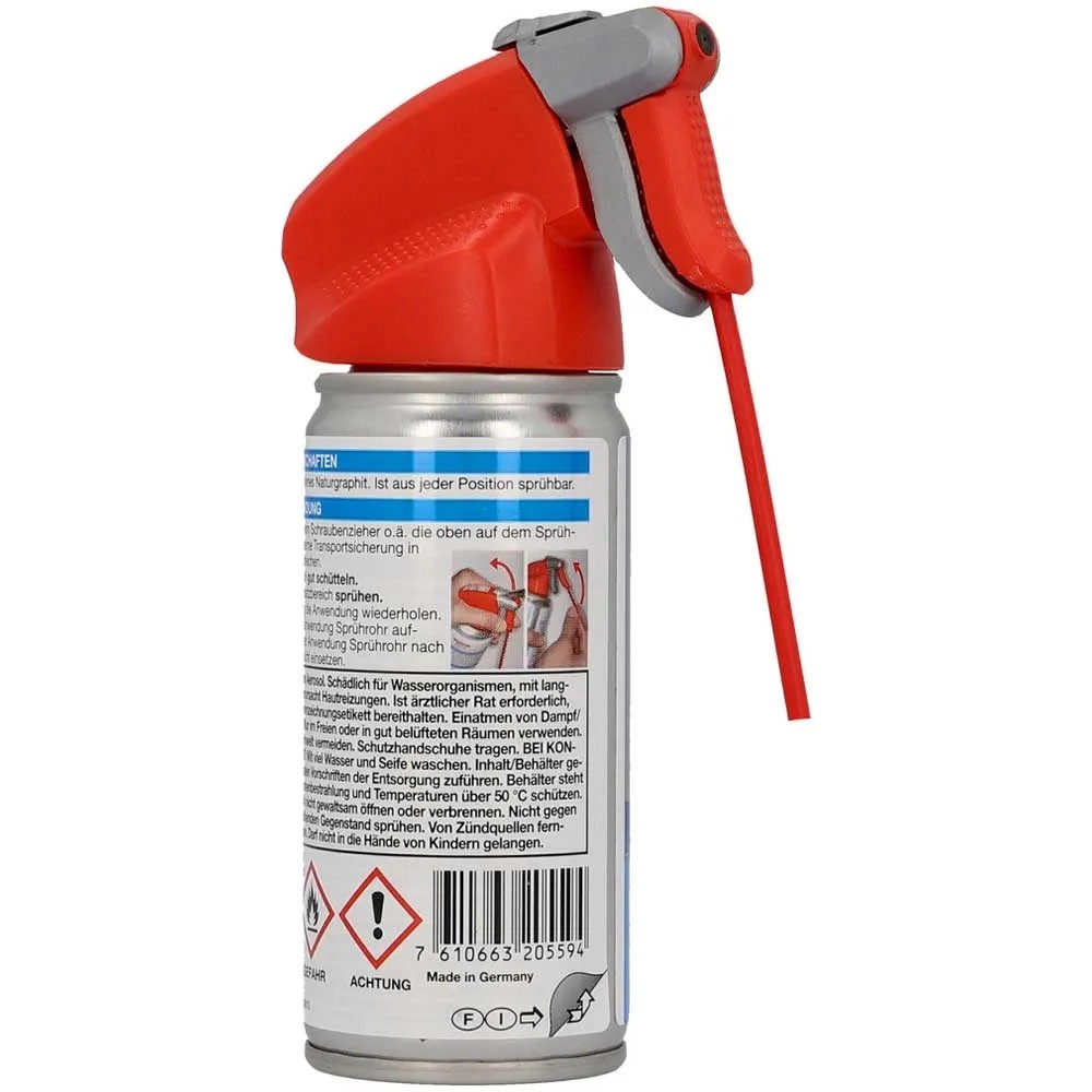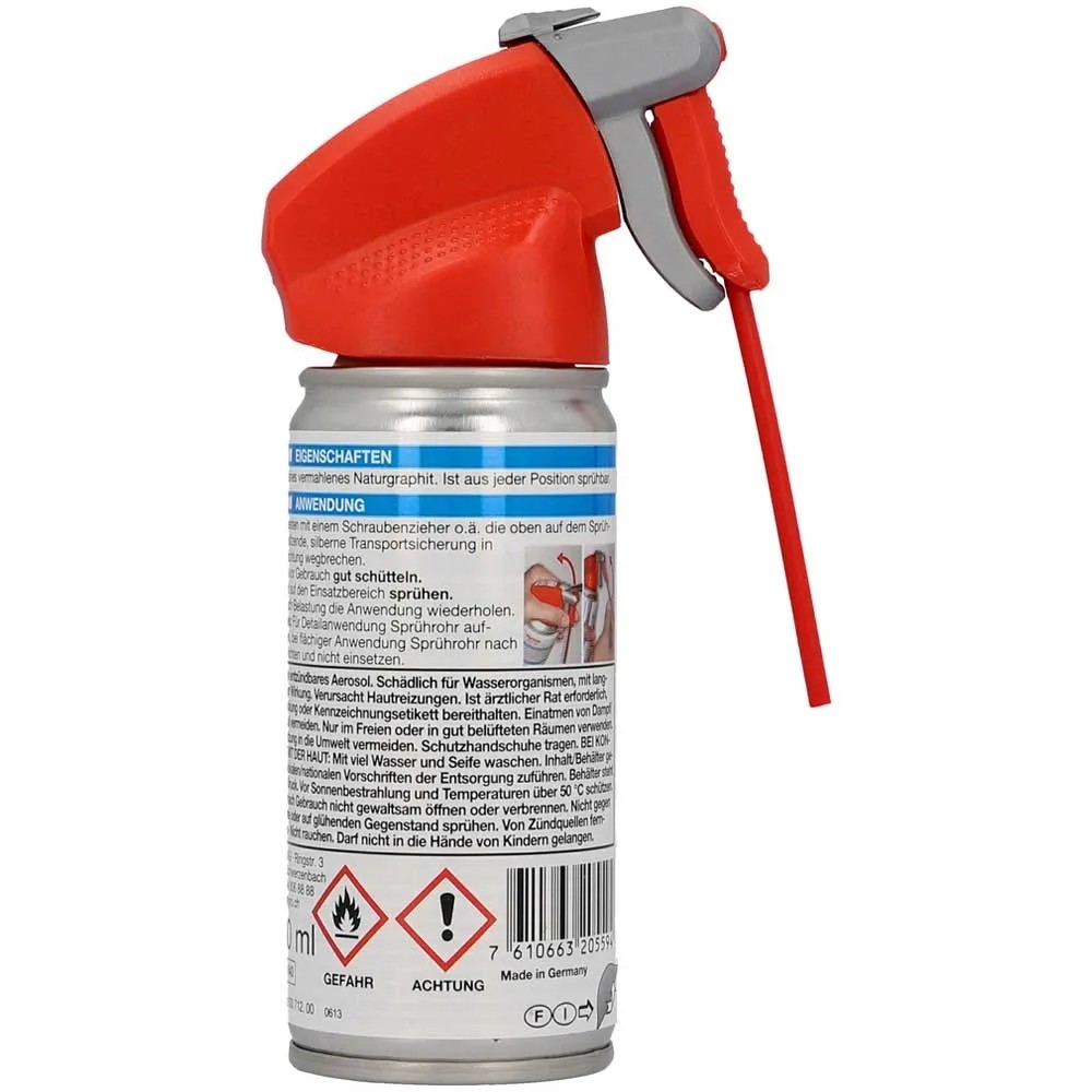 Zur zielgenauen Anwendung und einfachen Dosierung verfügt das Graphit-Spray über ein Sprührohr. Das Pulver ist aus jeder Position sprühbar und bleibt sofort haften.
