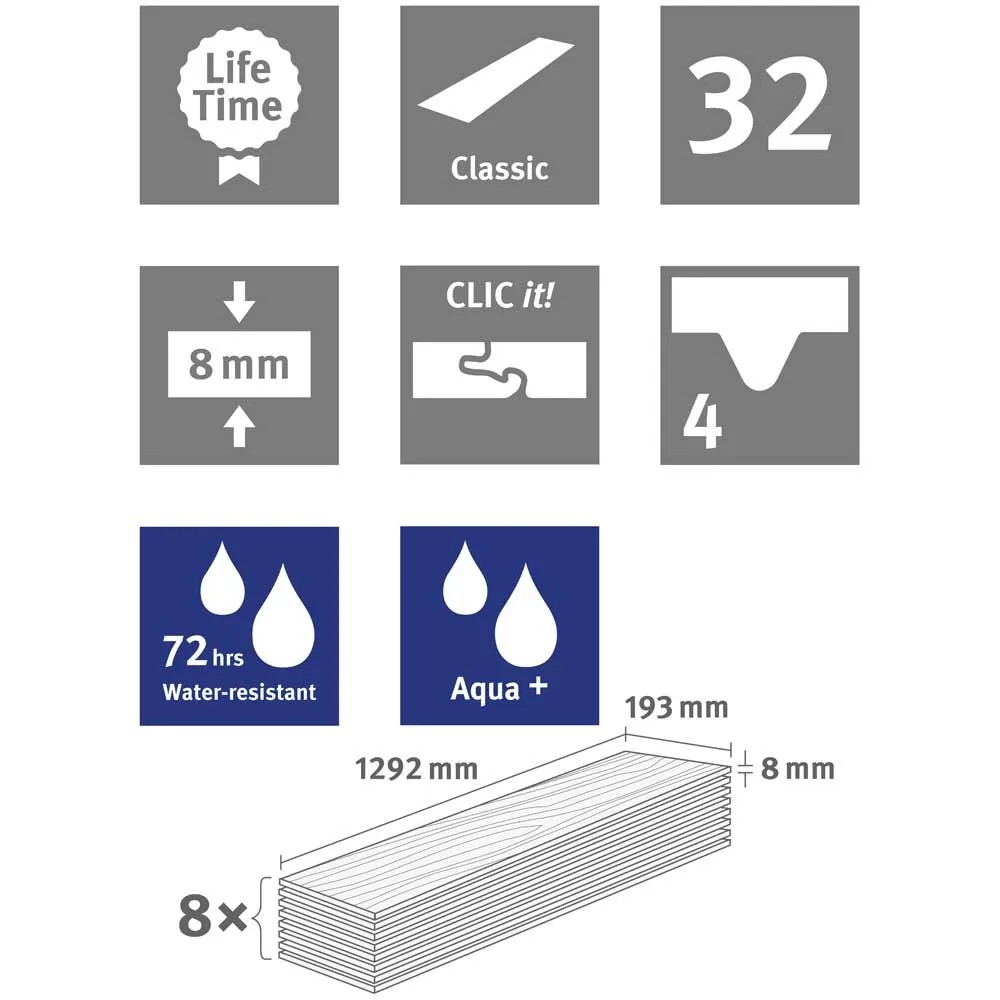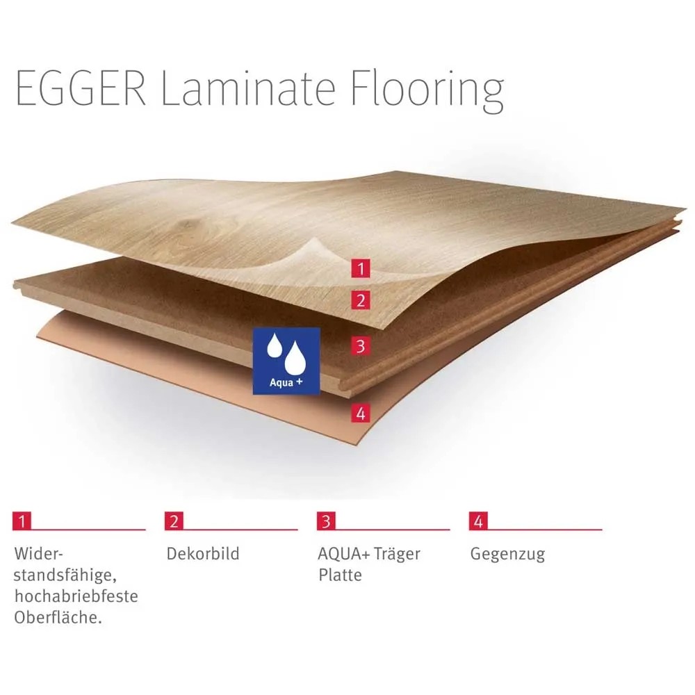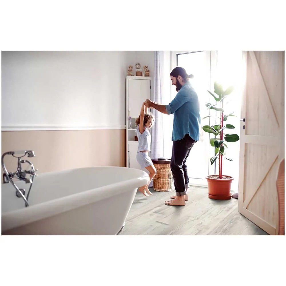 Kalte Fliesen, ade: Entscheiden Sie sich für einen Boden, der nachhaltig produziert und schnell verlegt ist. Unser Laminat-Boden mit spezieller Aqua+ Technologie hält Wasser zuverlässig ab. Dank der feuchtigkeitsresistenten Aqua+ Trägerplatte ist er perfekt für Bad, Küche und Flur geeignet. Und natürlich auch für die gewerbliche Nutzung mit erhöhten Reinigungszyklen. Schliesslich kann unser Aqua+ Laminat-Boden besonders einfach gereinigt werden - sogar mit einem Dampfreinniger.