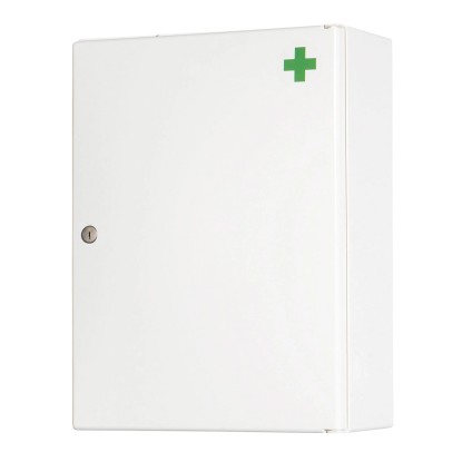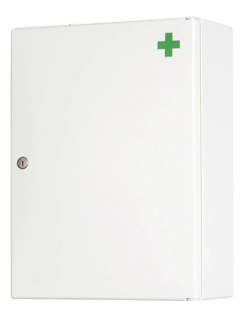 Der Medikamentenschrank aus Kunststoff ist verschliessbar, hat Türablageschalen und einen Grünkreuz-Aufkleber.