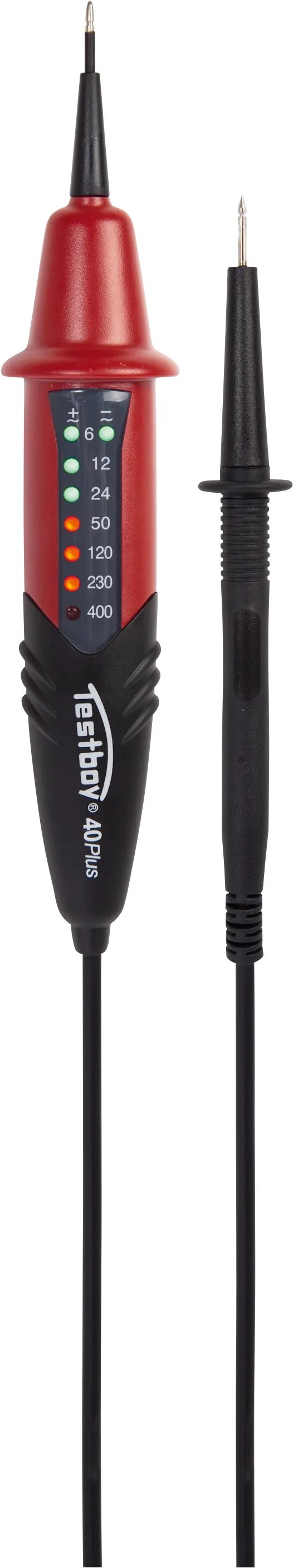 Der Testboy 40 Plus überzeugt durch eine anwenderfreundliche Bauform und ein robustes Gehäuse aus hochwertigem Kunststoff mit gummiertem Griffbereich, das eine lange Einsatzbereitschaft garantiert. Die Überspannungskategorie lautet CAT III 400 V. Der Spannungsbereich beträgt 6 V - 400 V AC/DC.