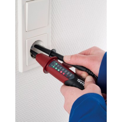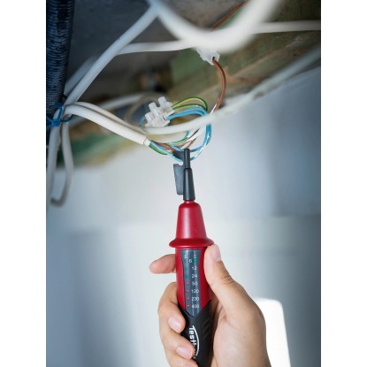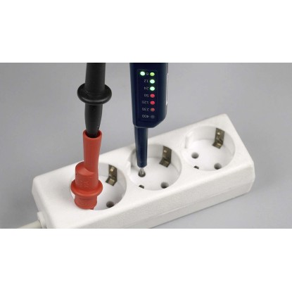 Der 2-polige rot-schwarze LUX-TOOLS Spannungsprüfer aus dem Hause Testboy vereint zwei Funktionen. Zum Einen werden Gleich- und Wechselspannungen im Bereich von 6 bis 400 V optisch über eine 7-stufige LED Anzeige angezeigt. Zum Anderen ermöglicht die Elektronik die Phasensuche gegen den Schutzleiter.