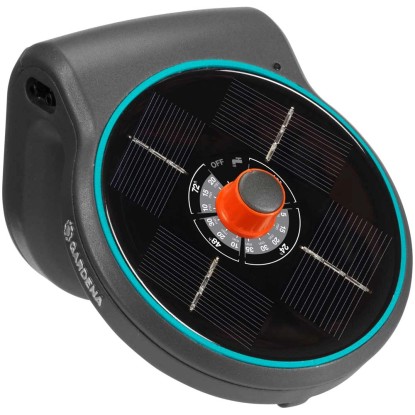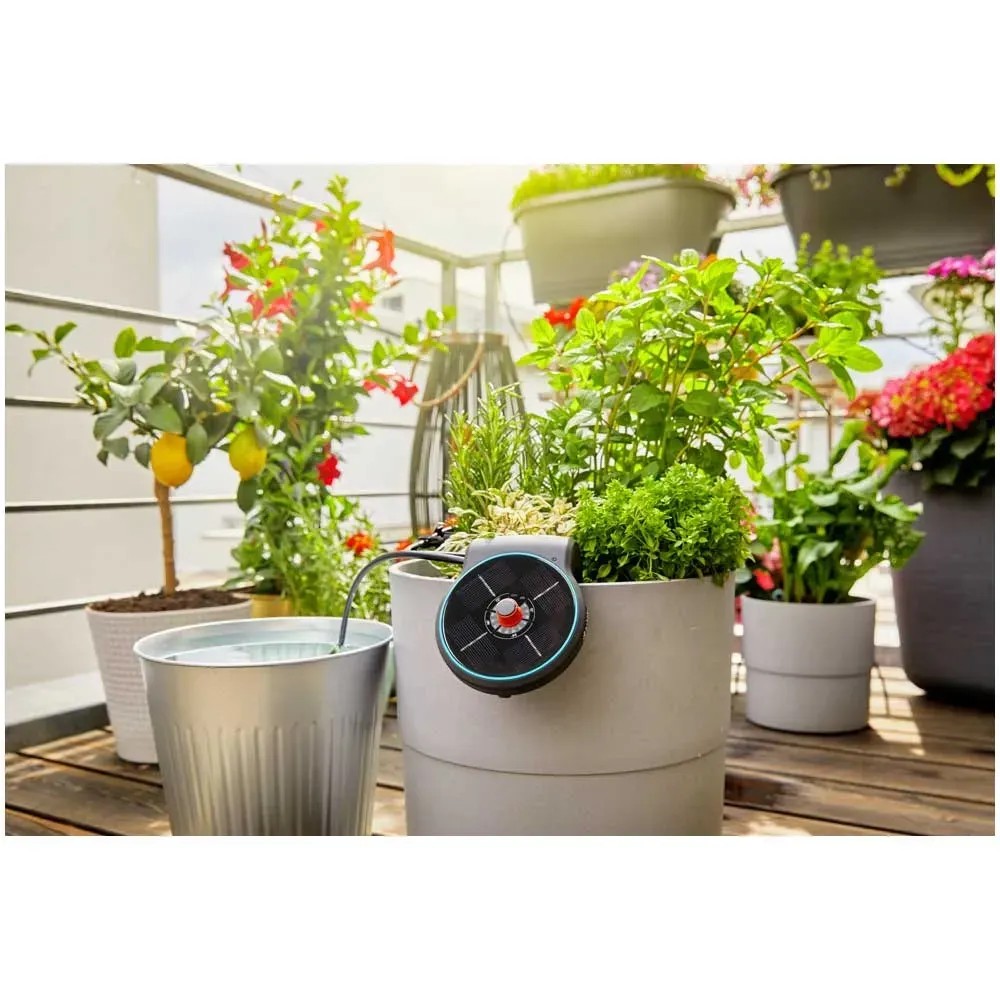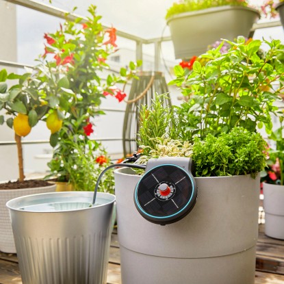 Das Gardena AquaBloom-Set ist die unabhängige, automatische Bewässerungslösung für die Pflanzen auf Balkon und Terrasse. Besonders praktisch: sie funktioniert ohne Strom und Wasseranschluss und versorgt die Pflanzen in Kästen und Kübeln optimal. Gerade bei längerer Abwesenheit oder im Urlaub garantiert der AquaBloom für eine optimale Bewässerung der Pflanzen. Die Haupteinheit ist Pumpe, Kontrolleinheit und Solarpanel in einem und kann flexibel platziert werden, zum Beispiel hängend an der Hauswand, am Topfrand, Balkongeländer oder stehend auf dem Tisch. Schon ein Tag Sonnenschein genügt, um per Solarpanel die Batterien aufzuladen. Für die Bewässerung kann eines von 14 vordefinierten Programmen gewählt werden, welche Dauer und Frequenz der Bewässerung regelt. Die leise Pumpe fördert das gefilterte Wasser aus einem beliebigen Behälter zu den Pflanzen. Das AquaBloom Set ist komplett mit der 3in1 Haupteinheit, wiederaufladbaren Batterien, druckkompensierenden Tropfen, Verbindungsstücken, Verschlusskappen, einem 20-Meter-Verteilerrohr und einem Filter. Zusätzlich ist nur noch ein Wasserbehälter nötig. Das Set ist ausreichend für die Bewässerung von bis zu 20 Pflanzen.