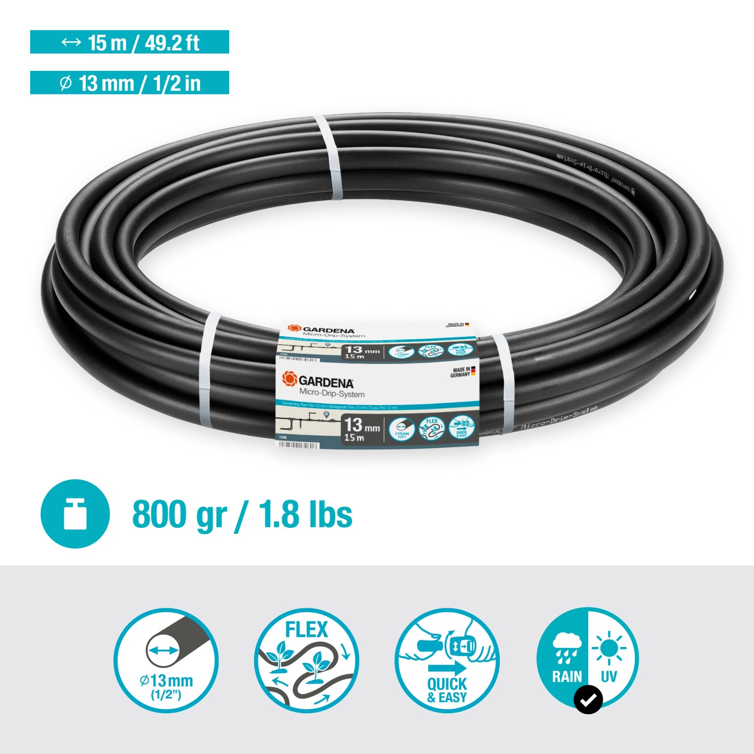 Das Gardena Verlegerohr ist die zentrale Versorgungsleitung im Gardena Micro-Drip-System. Das Verlegerohr ist UV-stabilisiert und lichtundurchlässig, was einen langen Einsatz gewährleistet. Eine Verlegung ist sowohl ober- als auch unterirdisch möglich.