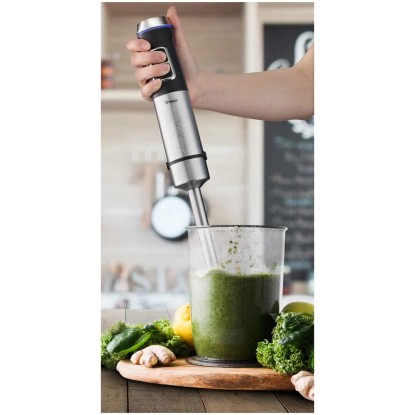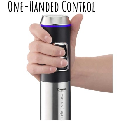 Dieser robuste Stabmixer von Trisa aus Edelstahl zerkleinert Lebensmittel mit dem Vier-Klingenmesser und dem 1'200-W-Motor besonders zuverlässig. Er bietet eine stufenlose Geschwindigkeitsregulierung sowie eine Turbo-Funktion. Dank ergonomischem Griff ist eine sichere, einhändige Bedienung möglich.