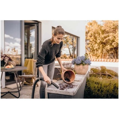 Mit dem einteiligen Patronenfilter kann sowohl nasser als auch trockener Schmutz ohne Filterwechsel aufgenommen werden. Die Blasfunktion erleichtert das Reinigen schwer zugänglicher Stellen. Der Saugschlauch lässt sich platzsparend am Gerätekopf aufbewahren. Das Kabel kann am Kabelhaken verstaut werden, Rohre und Bodendüsen am Bumper. Das Pull & Push-Verschluss-System ermöglicht ein einfaches Öffnen und Schließen des Behälters. Der Handgriff ist abnehmbar, sodass Zubehör direkt auf den Saugschlauch gesteckt werden kann.