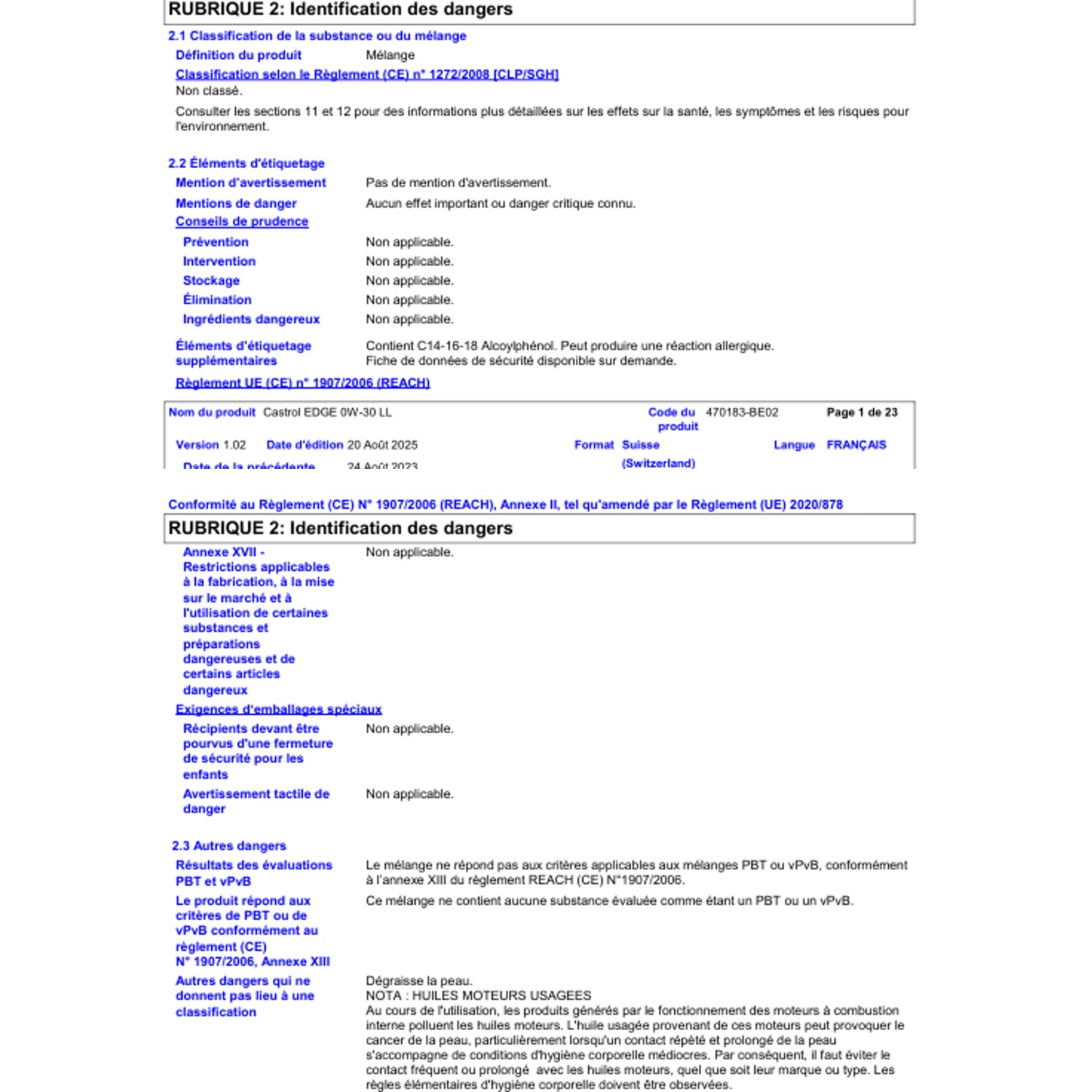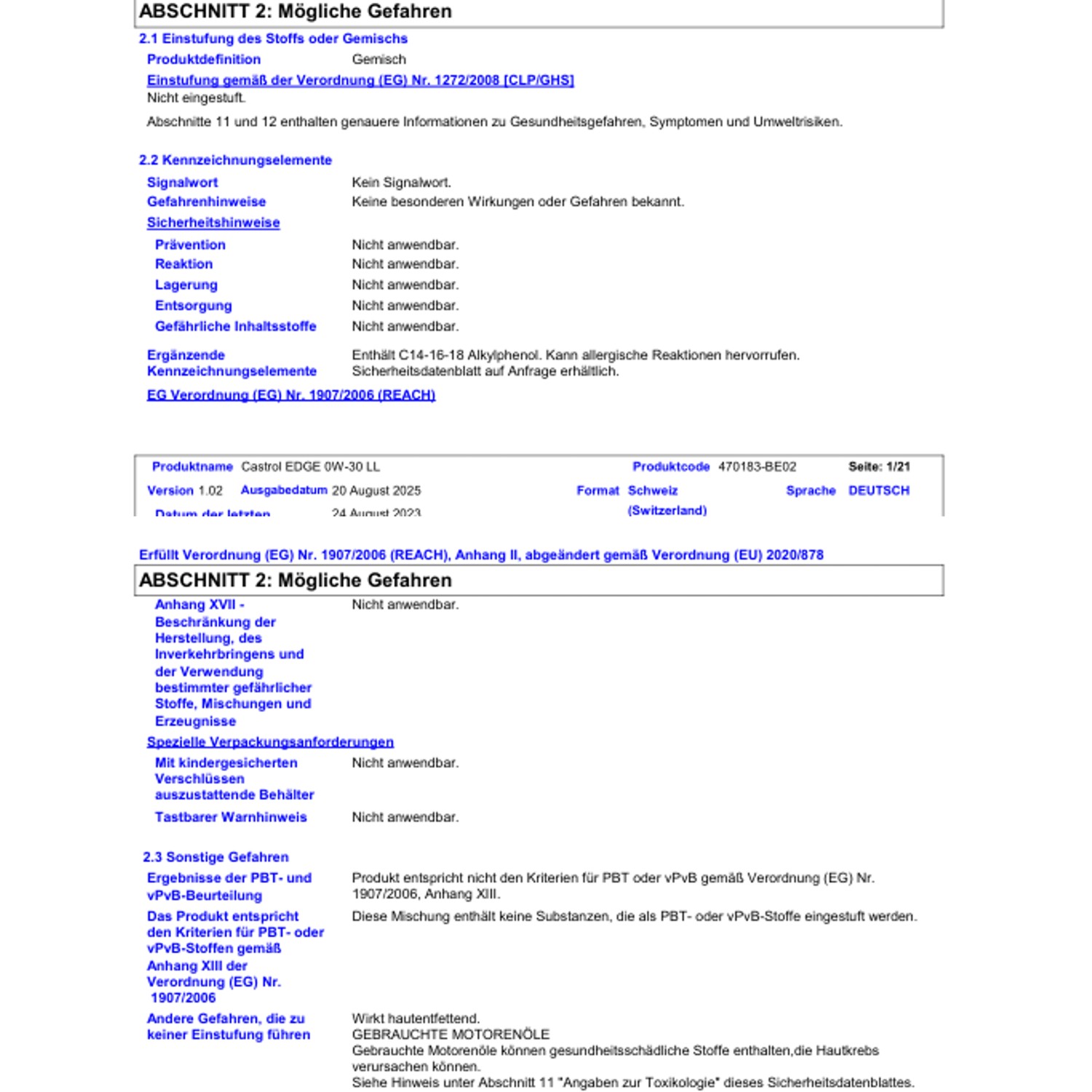 | Viskositäten: | SAE 0W-30 |