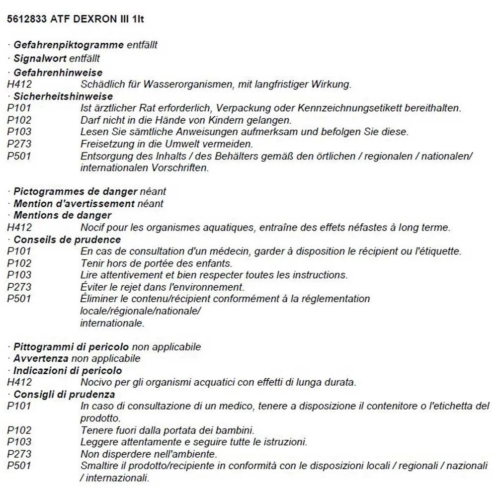 Spezifikationen: DEXRON III H, ALLISON C4, CATERPILLAR TO-2, MERCON, VOITH H55.6335.xx, ZF TE-ML-05L, ZF TE-ML-21L