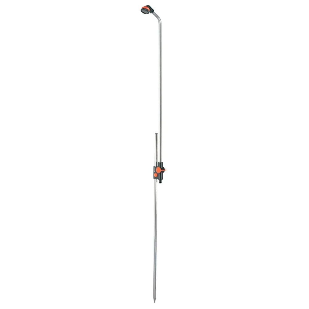 Die Gardena Gartendusche Solo ermöglicht ein erfrischendes Vergnügen an heissen Tagen. Durch den Spike kann die Gartendusche einfach in den Rasen oder Sonnenschirmständer gesteckt werden. Die stufenlose Höhenverstellung durch den Druckknopf bietet die ideale Fixierung der Brause für jede Körpergrösse. Das Regulier- und Absperrventil zur Mengenregulierung gibt die gewünschte Wassermenge frei. Mit dem weichen Brausestrahl des grossen Duschkopfes bekommen Sie eine angenehme Erfrischung.