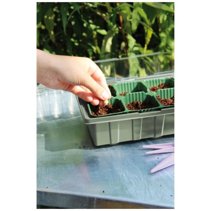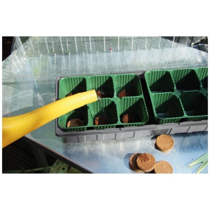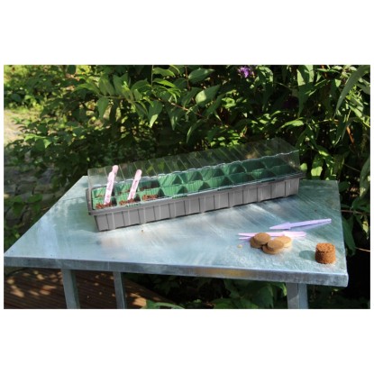Das Zimmer-Treibhaus mit 16 Plätzen besteht aus einer Anzuchtschale und einer transparenten Haube. Das Zimmergewächshaus kann in Kombination mit Kokos-Quelltabs verwendet oder direkt mit Anzuchterde befüllt werden.
