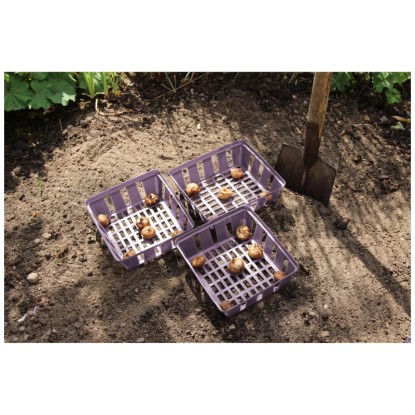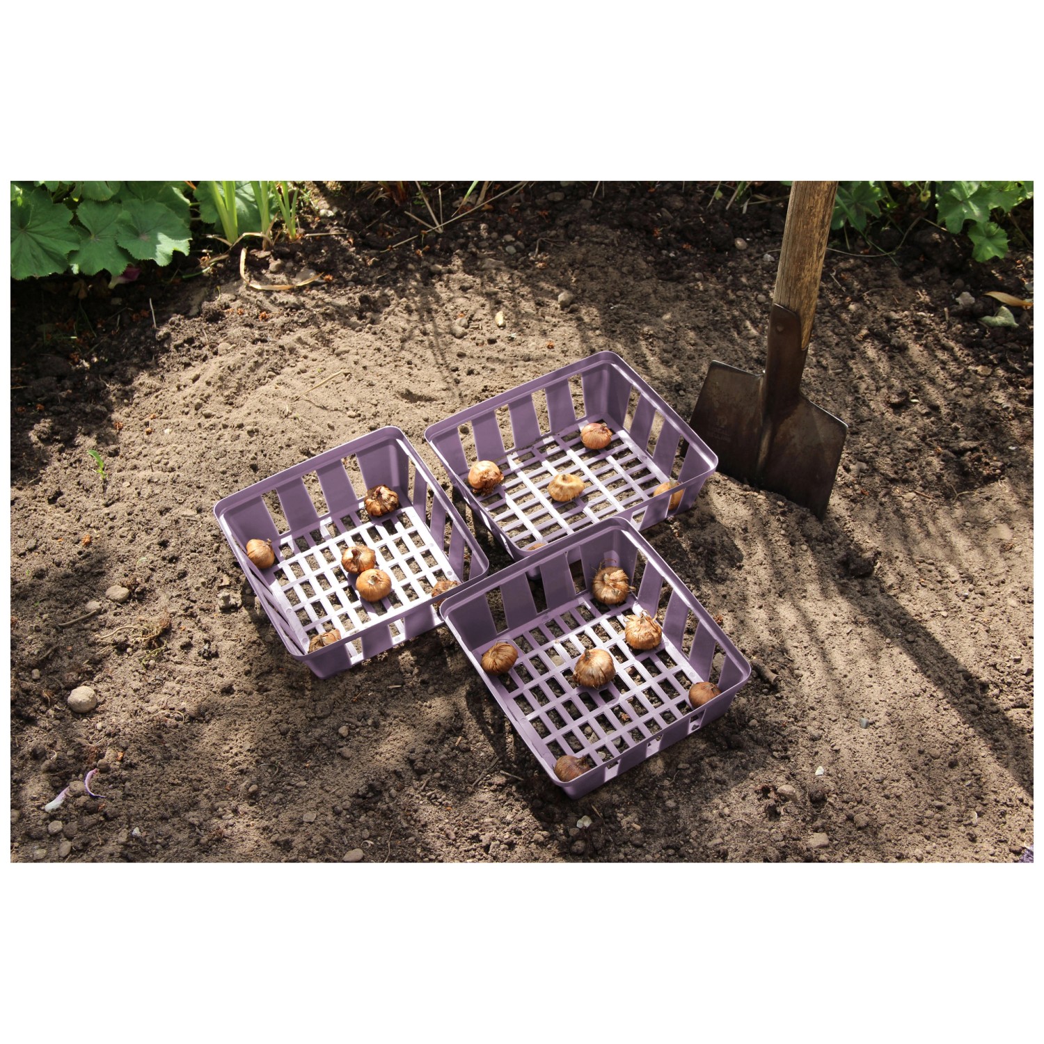 Die Blumenzwiebelschalen von Videx Garden sind ein praktisches Set aus drei eckigen Kunststoffbehältern in Flieder. Sie eignen sie sich ideal zum Einpflanzen und Lagern von Blumenzwiebeln. Die Schalen schützen die Zwiebeln vor Nagetieren und Schädlingen und ermöglichen eine flexible Bepflanzungsanordnung. Dank der durchlässigen Konstruktion lassen sich die Zwiebeln nach der Blütezeit schonend ausgraben. Die wiederverwendbaren Behälter können auch als Pflanzkorb eingesetzt werden und erleichtern so die Gartenarbeit.