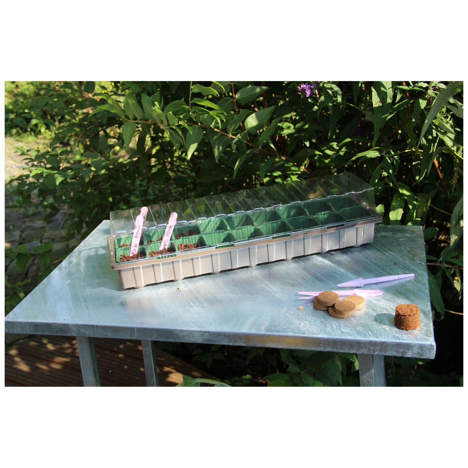 Das Zimmertreibhaus von Videx Garden ist ein praktisches Hilfsmittel für die Anzucht von Pflanzen im Innenbereich. Mit einer seiner Grösse passt es perfekt auf jede Fensterbank. Es besteht aus einer Anzuchtschale mit 18 Stellplätzen und einer transparenten Haube, die ein ideales Mikroklima für Jungpflanzen und Stecklinge schafft. Die glatte Innenseite der Töpfe schont die empfindlichen Wurzeln. Das Gewächshaus kann wahlweise mit Kokos-Quelltabs, Anzuchttöpfen oder direkt mit Erde befüllt werden und ist vielseitig einsetzbar und wiederverwendbar.