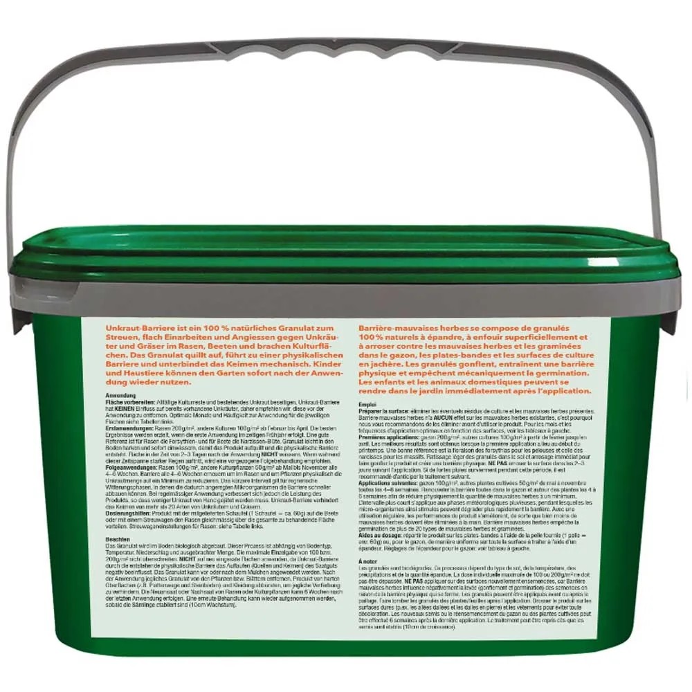 Unkraut-Barriere ist ein 100 % natürliches Granulat zum Streuen, flach Einarbeiten und Angiessen gegen Unkräuter und Gräser im Rasen, Beeten und brachen Kulturflächen. Das Granulat quillt auf, führt zu einer physikalischen Barriere und unterbindet das Keimen mechanisch. Kinder und Haustiere können den Garten sofort nach der Anwendung wieder nutzen.