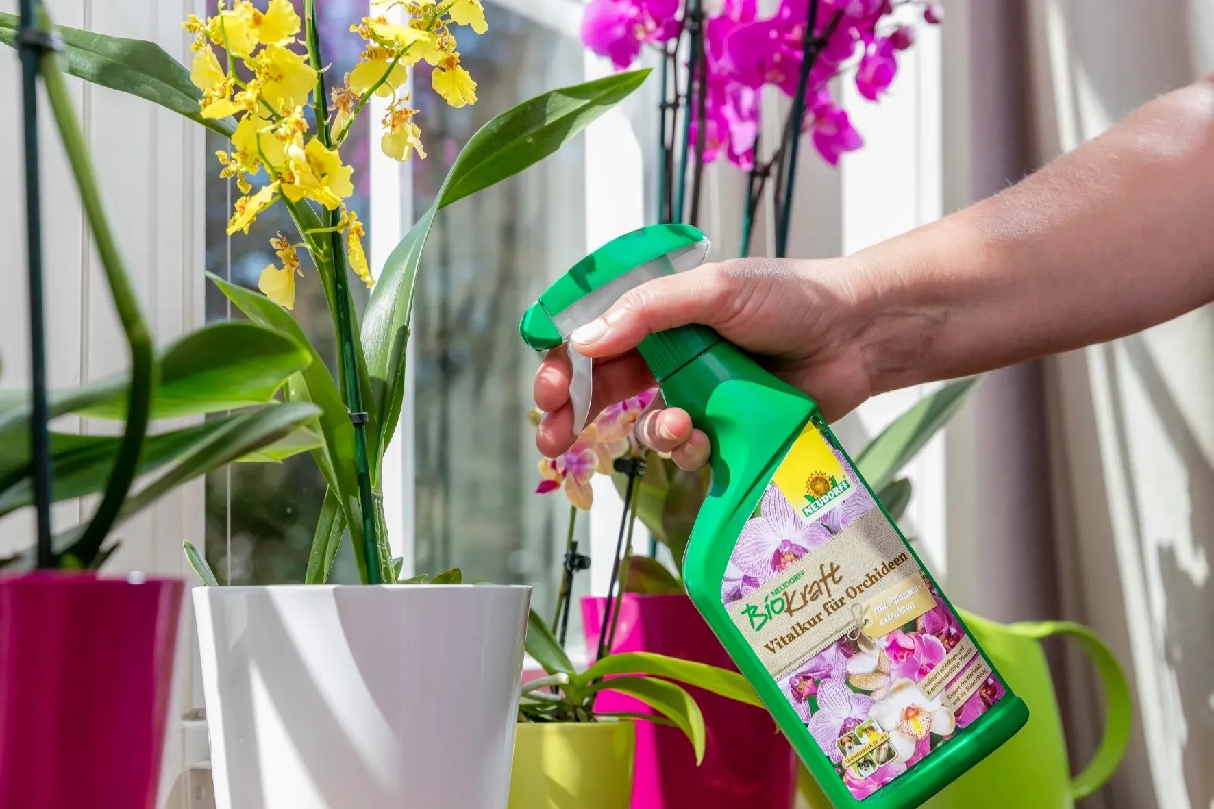 Die anwendungsfertige Biokraft Vitalkur für Orchideen mit Pflanzenextrakten, Harnstoff und Pflanzenhilfsmitteln vitalisiert schädlings- und krankheitsanfällige Orchideen. Dieser Effekt ist wissenschaftlich bestätigt und fördert das vitale Wachstum und die Blütenbildung. Zudem verbessert die Vitalkur durch Erhöhung der Luftfeuchtigkeit das Mikroklima und ist unbedenklich für Haustiere, Bienen und andere Nützlinge.