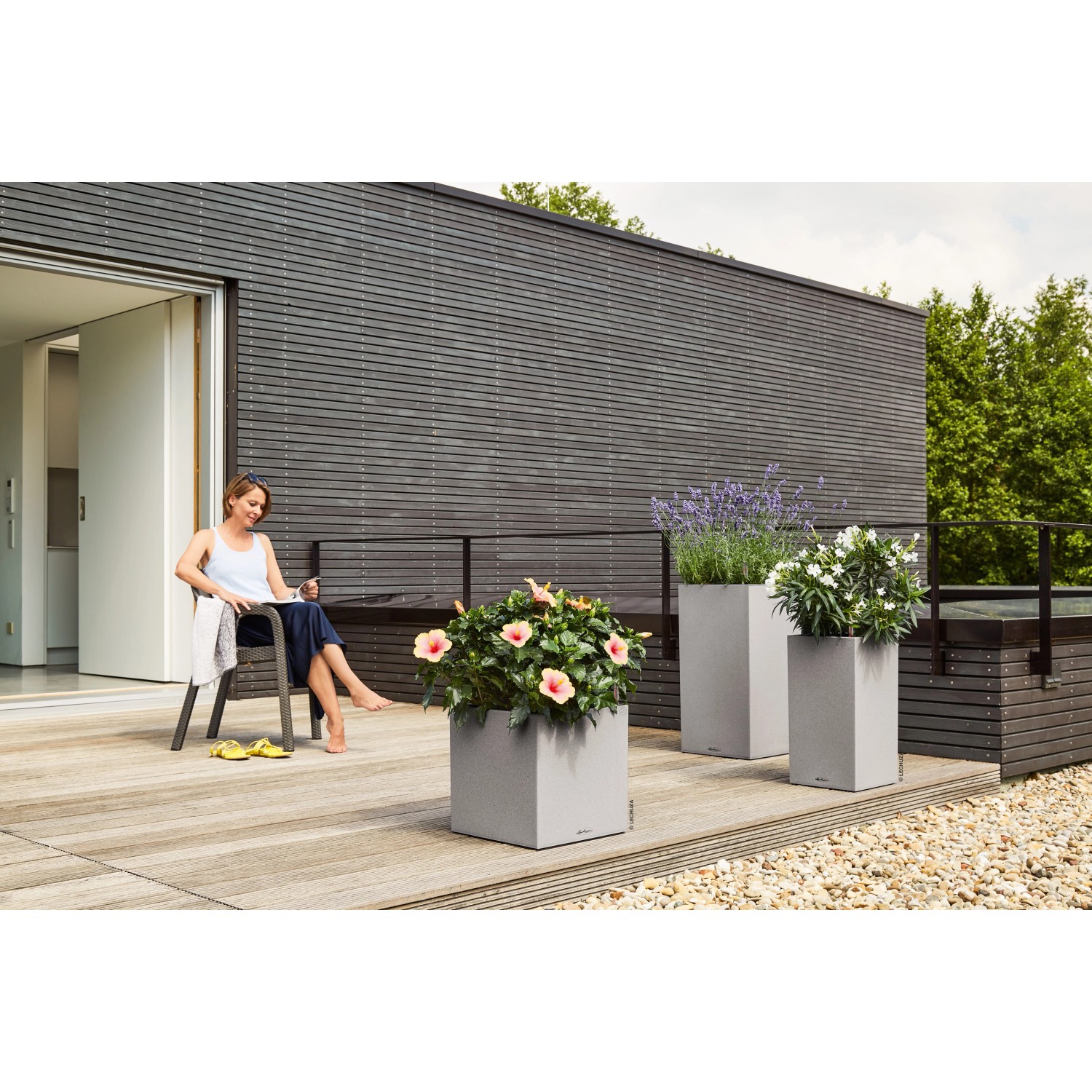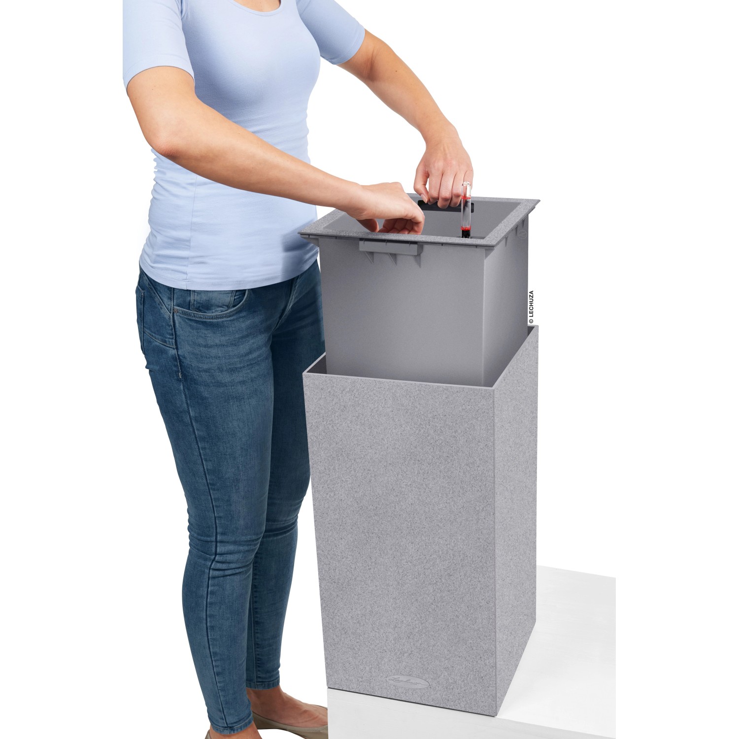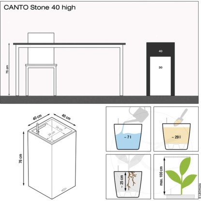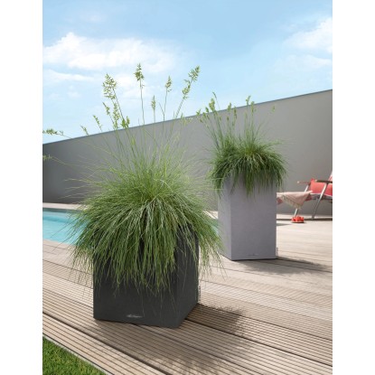 Wer klare Linien schätzt, wird Canto Color lieben. Die raue Naturstein-Optik in drei Farbtönen bildet einen wunderbaren Kontrast zu sattem Grün und bunten Blüten. Dank gleicher Abmessungen kann der Lechuza Canto Color Pflanzeinsatz zwischen den beiden Modellen Würfel und Säule problemlos getauscht werden.