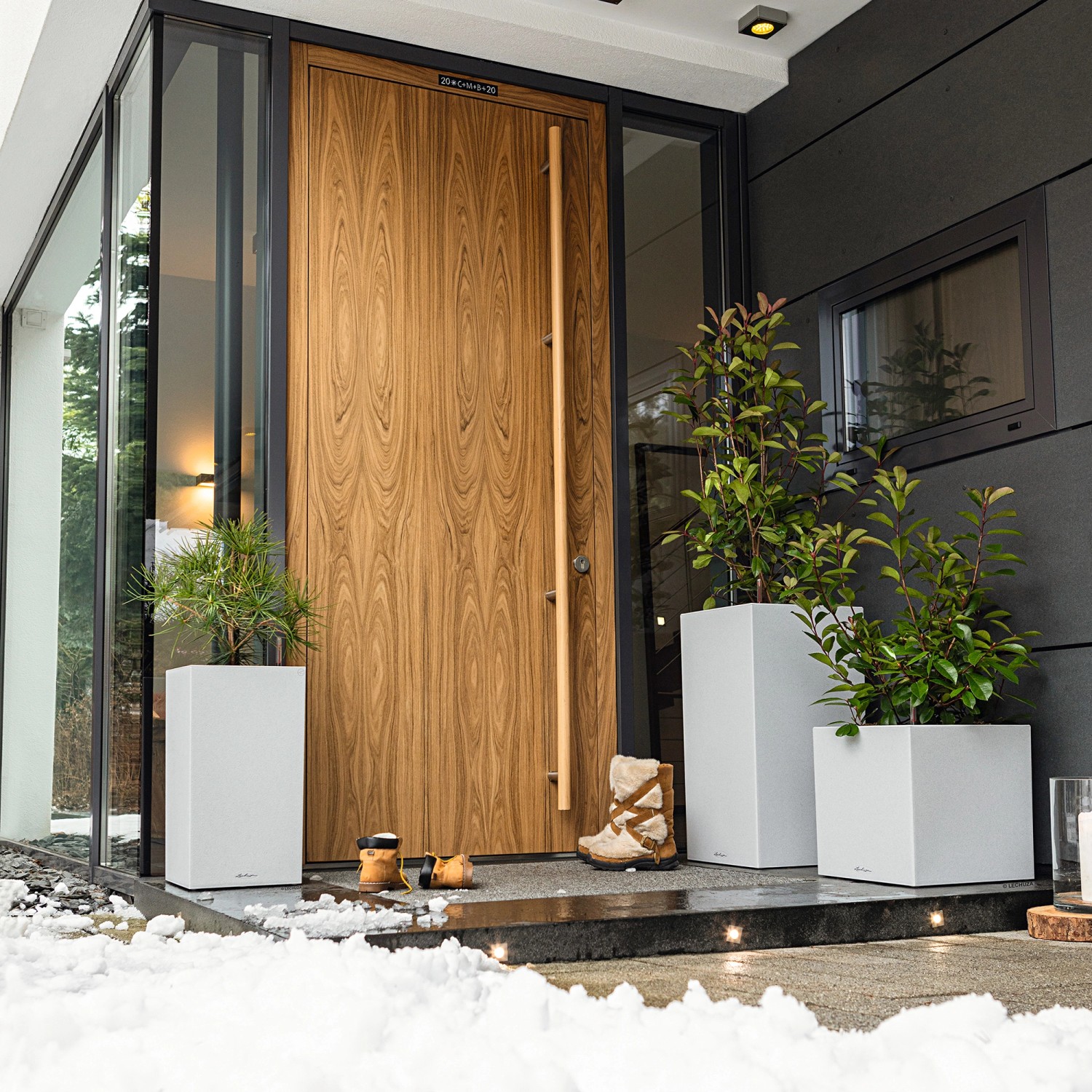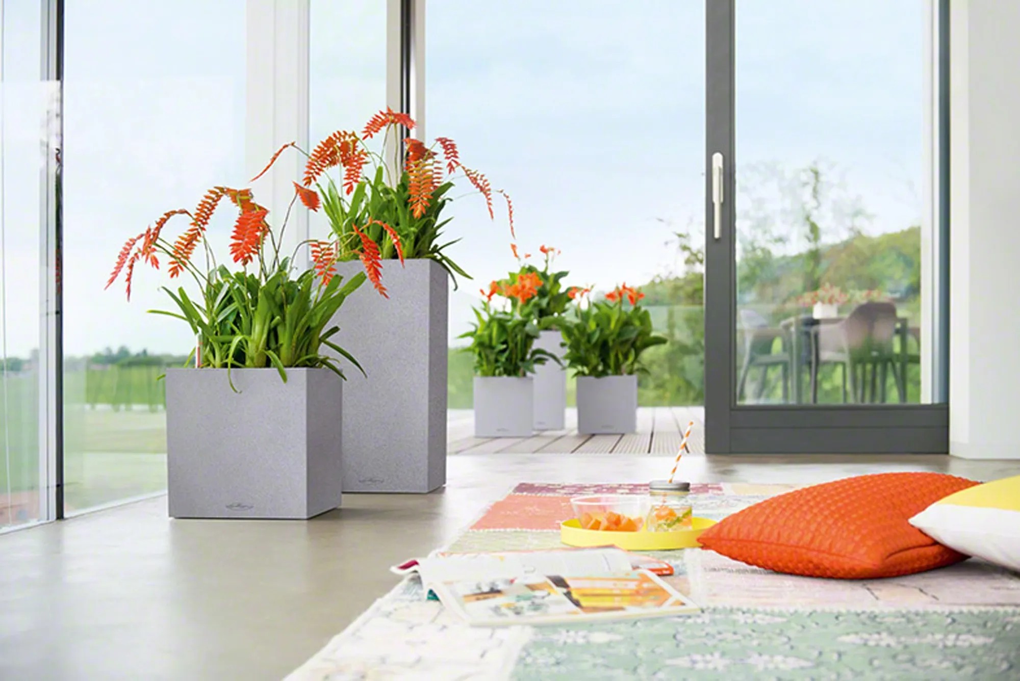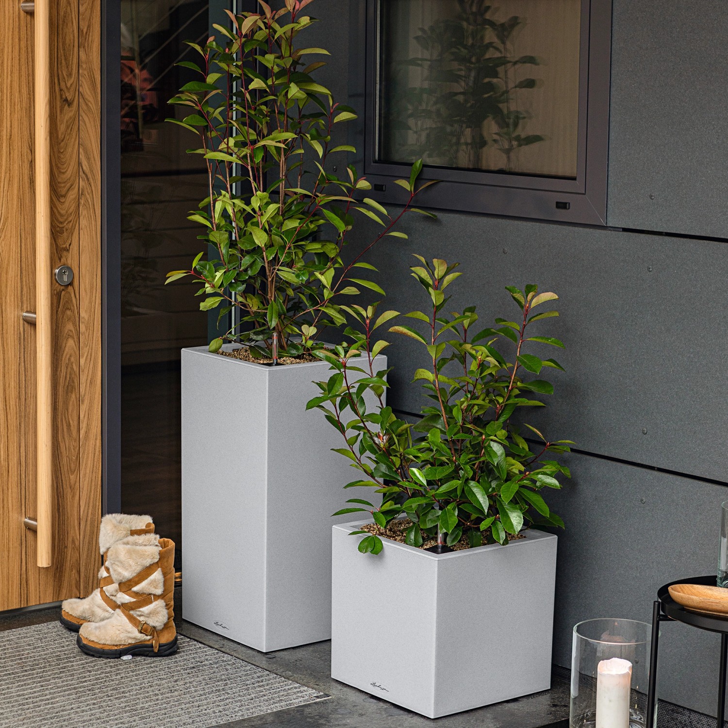 Wer klare Linien schätzt, wird Canto Color lieben. Die raue Naturstein-Optik in drei Farbtönen bildet einen wunderbaren Kontrast zu sattem Grün und bunten Blüten. Dank gleicher Abmessungen kann der Lechuza Canto Color Pflanzeinsatz zwischen den beiden Modellen Würfel und Säule problemlos getauscht werden.