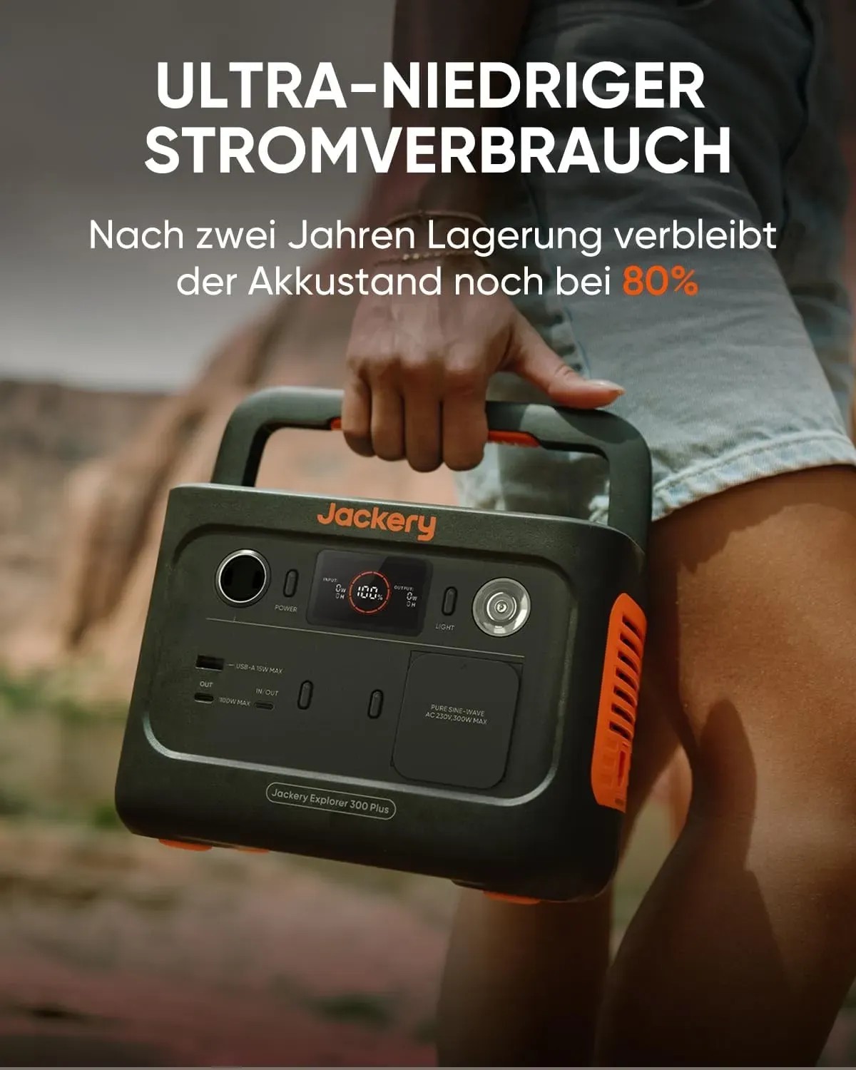 Die nachhaltige Jackery Explorer 300 Plus ist robust, schockresistent und feuerfest. Dank ihres geringen Gewichts und ihrer kompakten Masse kann sie bequem in jedem Rucksack transportiert werden.