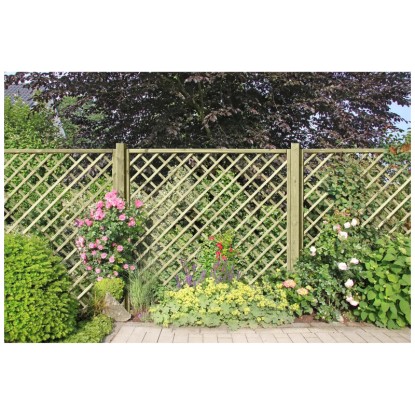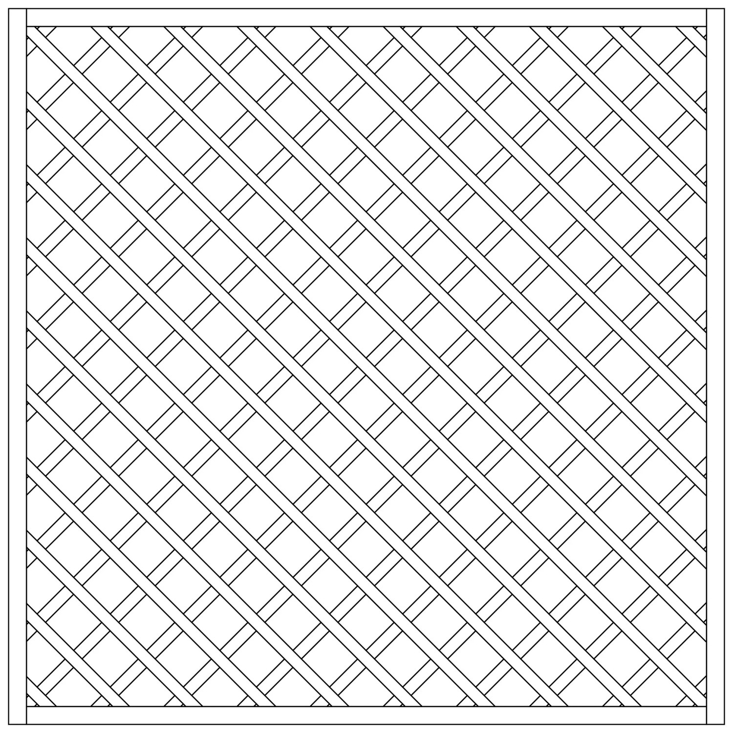 Dieses diagonale Rankgitter ist kesseldruckimprägniert Grün. Der Rahmen hat eine Höhe von 44 mm und eine Länge von 44 mm gehobelt. Die Leisten sind 12 mm breit und 30 mm lang. Die Maschenweite beträgt ca. 12 cm.