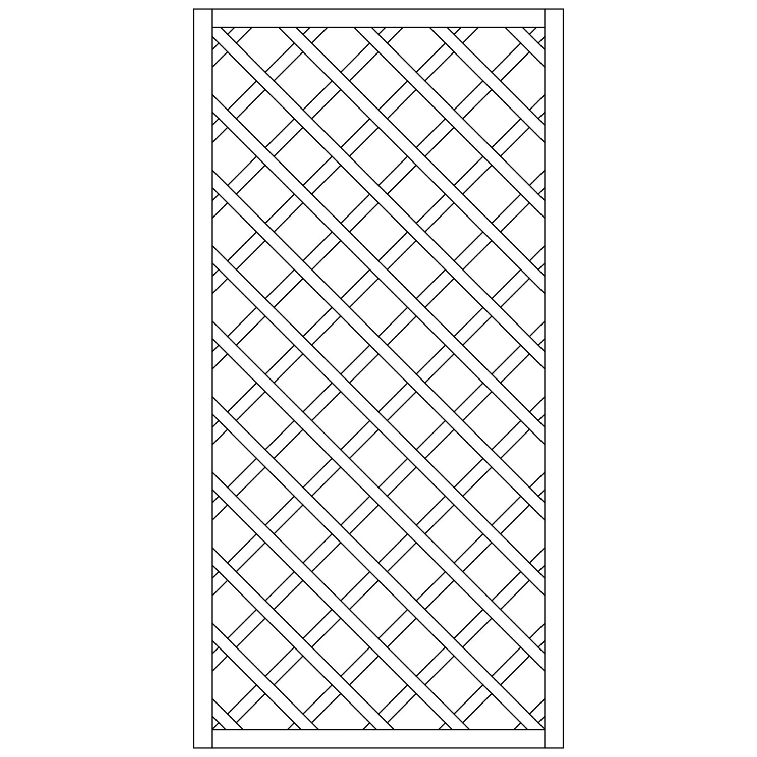 Dieses diagonale Rankgitter ist kesseldruckimprägniert Grün. Der Rahmen hat eine Höhe von 44 mm und eine Länge von 44 mm gehobelt. Die Leisten sind 12 mm breit und 30 mm lang. Die Maschenweite beträgt ca. 12 cm.