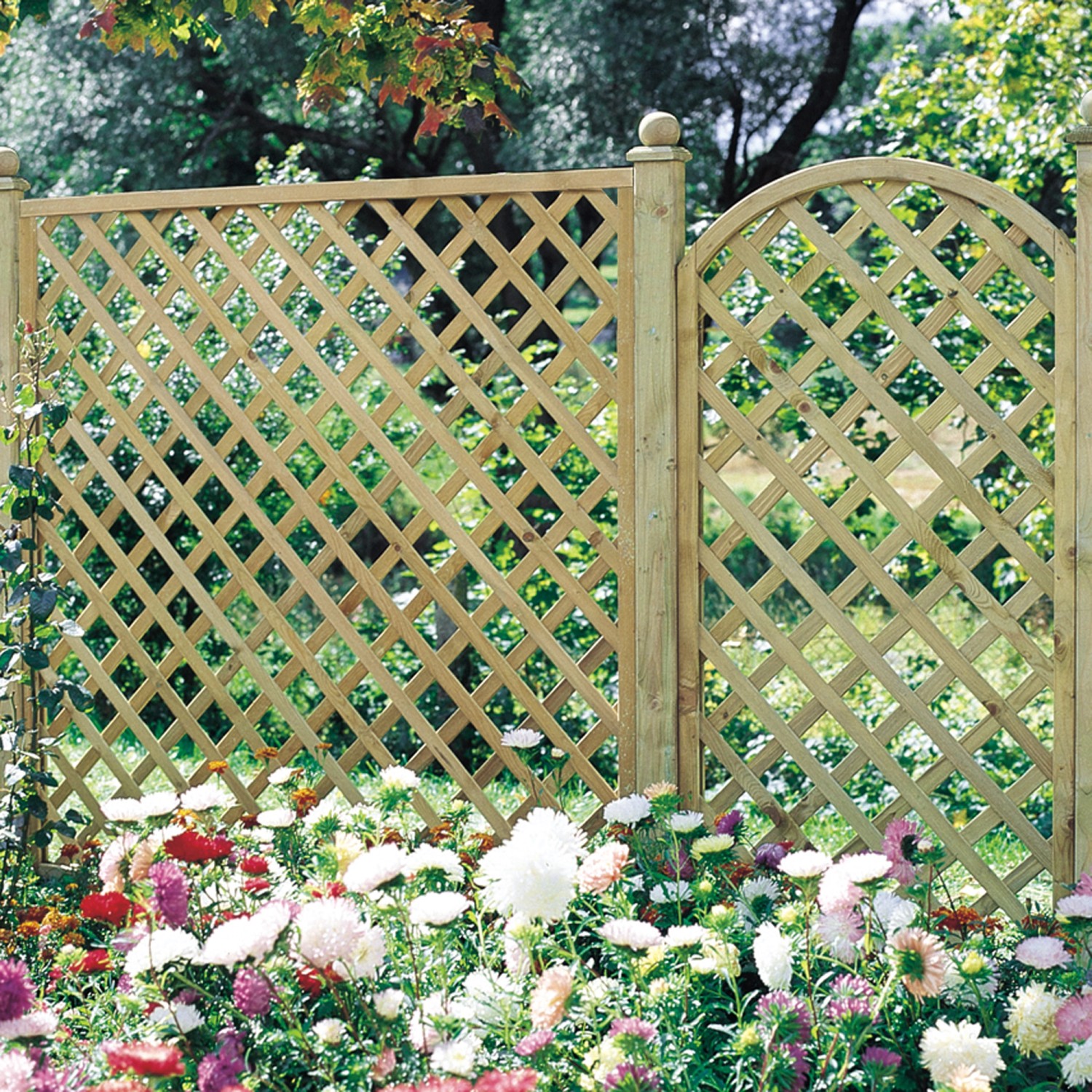 Das Rankgitter ist grün imprägniert und mit verzinkten Klammern geheftet. Die Leisten mit einer Abmessung von 8 mm x 30 mm sind glatt-gehobelt. Der Rahmen ist 4.5 cm x 4.5 cm stark und verzapft. Er ist ebenfalls glatt-gehobelt.