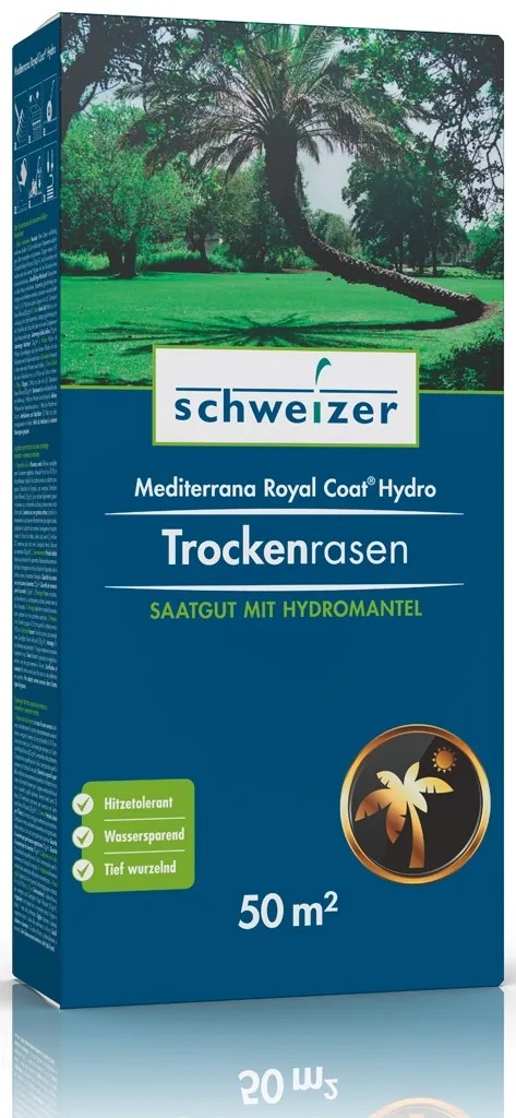 Der Trockenrasen Mediterrana Royal Hydro besitzt eine innovative Hülle. Die Spezialummantelung mit Hydrogel, Dünger und Pflanzenstärkungsmittel sorgt für kräftige, schnellauflaufende Jungpflanzen. Diese Rasenmischung ist die ideale Wahlfür trockene und heisse Standorte. Die hitze- und trockenheitstoleranten Arten bilden ein verzweigtes Wurzelsystem, welches die Rasengräser auch während trockenen Perioden mit tieferliegendem Wasser versorgt.