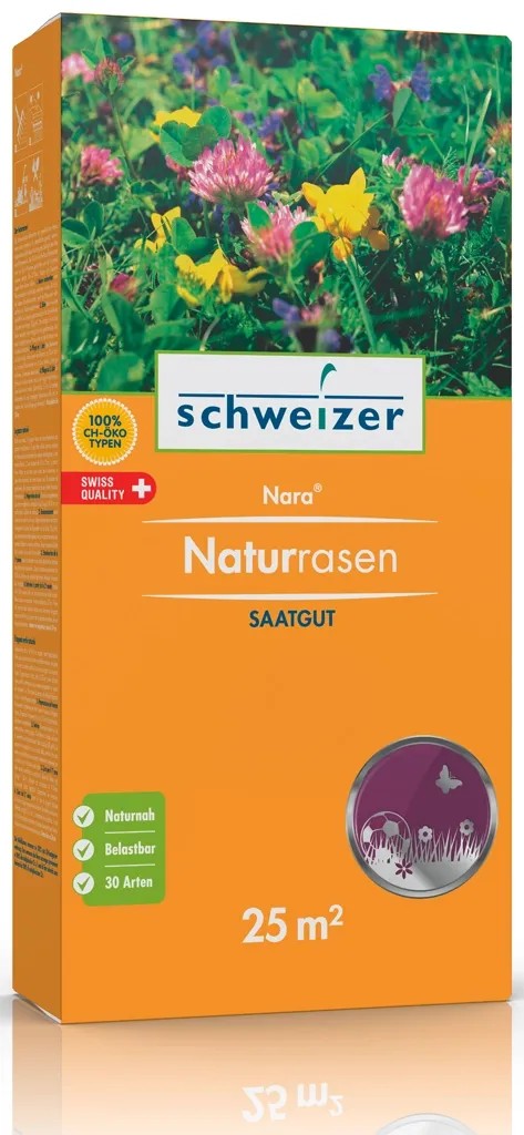 Die blumenreiche Alternative zum gewöhnlichen Rasen. Nara kann einerseits als Rasen genutzt werden, andererseits bietet diese Mischung die Vielfalt einer Blumenwiese. Der 10 - 25 cm hohe Nara-Blumenrasen wird nur alle vier Wochen geschnitten und darf jederzeit betreten werden. Die mehr als 30 Kräuter- und Kleearten lassen Ihren Rasen blühen.