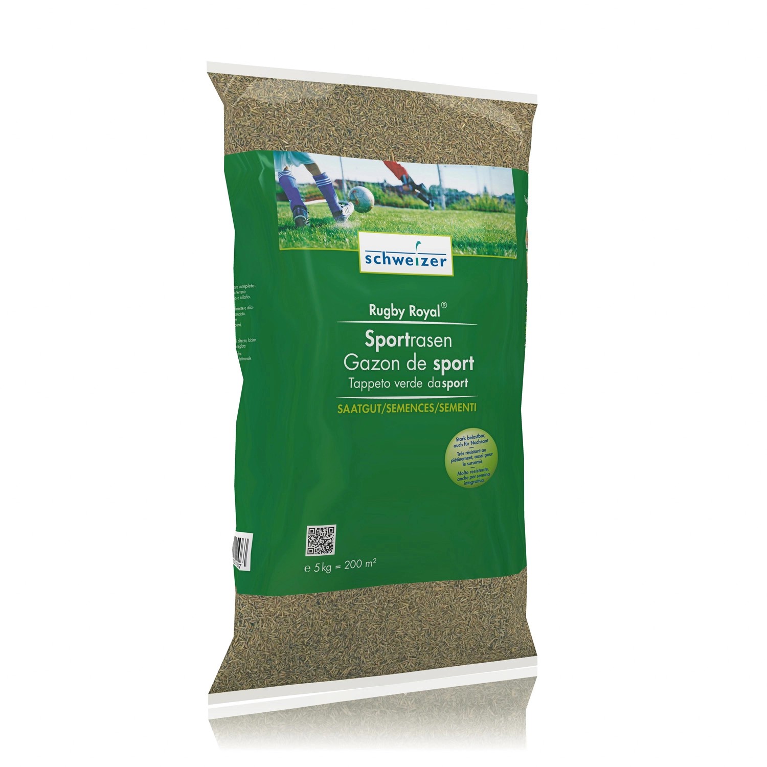 Der Sportrasen Rugby Royal von Schweizer ist perfekt für Rasenflächen mit hohen Belastungen und intensiver Nutzung. Die strapazierfähigen Sorten sorgen für einen sehr widerstandsfähigen Rasen. Rugby Royal ist auch für Nachsaaten geeignet.