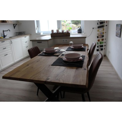Die geölte Tischplatte aus Wildeiche mit natürlich gewachsener Baumkante eignet sich perfekt für Ihr Traummöbelstück. Gestalten Sie Ihren Esstisch ganz nach Ihren individuellen Vorstellungen. Die Baumkante verleiht eine natürliche und lebendige Ausstrahlung mit einem rustikalen Akzent.