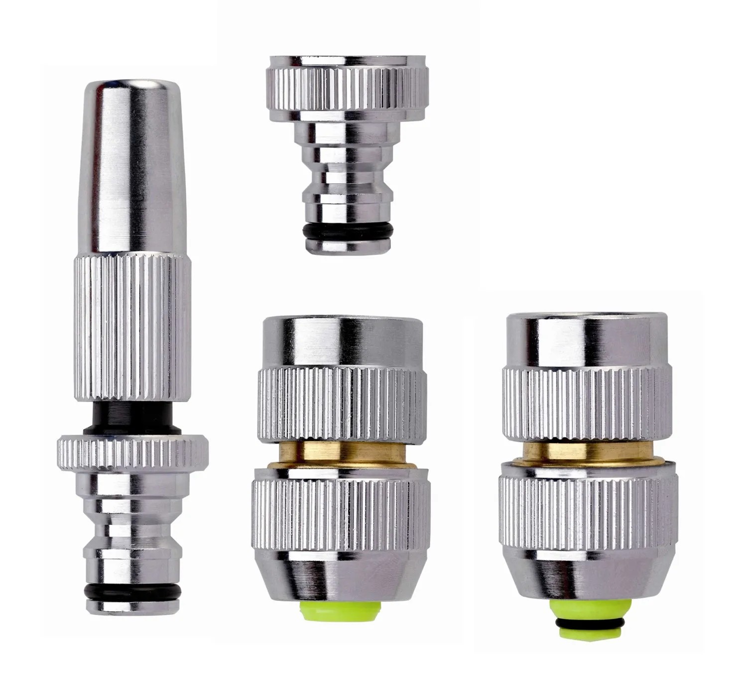 Das Anschluss-Set ist mit Messing verchromt und enthält Aquajet Schlauchstück 13 mm/15 mm, Aquajet Schlauchstück 13 mm/15 mm mit Stop, Aquajet Hahnstück 3/4" und Aquajet Schlauchspritze stufenlos. Geeignet für alle Schläuche 12,5 mm - 15,5 mm (1/2-5/8).