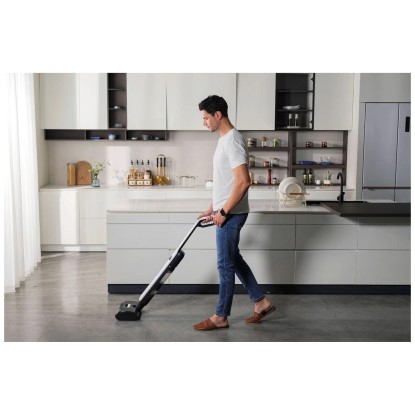 Der Hartbodenreiniger Wet Clean Comfort T1870 von Trisa bietet eine effektive Lösung für die Reinigung Ihrer Hartböden. Mit einem 30-Watt-Motor entfernt er zuverlässig hartnäckige Verschmutzungen. Das Zwei-Wassertank-System trennt sauberes und schmutziges Wasser, um eine hygienische Reinigung zu gewährleisten. Der ergonomische Griff und das leichte Design ermöglichen eine einfache Handhabung, während der 180°-Neigungswinkel das Reinigen unter Möbeln erleichtert. Mit einer 2'000-mAh-Batterie kann der Reiniger bis zu 45 Minuten betrieben werden und zeigt den Batteriestatus auf einem LED-Display an. Eine Selbstreinigungsfunktion hält die Bürstenrolle sauber, was die Wartung vereinfacht. Ausserdem sorgt der geräuscharme Betrieb mit 58 dB für eine angenehme Nutzung.