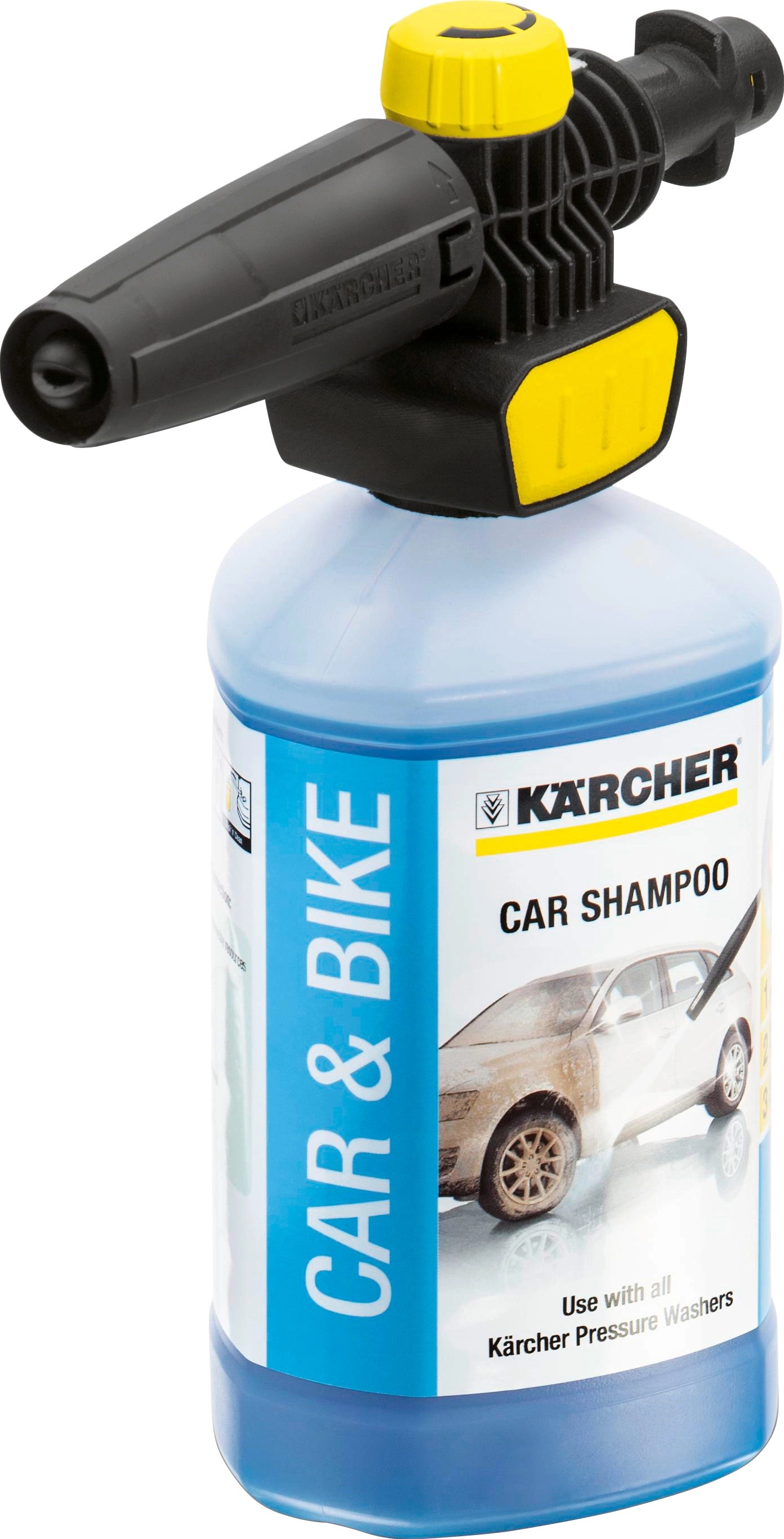 Im Lieferumfang ist neben der Schaumdüse auch das Kärcher 3in1-Autoshampoo enthalten. Dieses eignet sich für den Auftrag mit der Schaumdüse und ermöglicht eine schnelle und gründliche Reinigung Ihres Autos oder Motorrads. Die Schaumdüse wird mit nur einem Klick an der Flasche befestigt, und das Einschäumen kann beginnen. Anschließend sollten Sie das Fahrzeug mithilfe einer Waschbürste (separat erhältlich) reinigen und das Autoshampoo wieder entfernen.