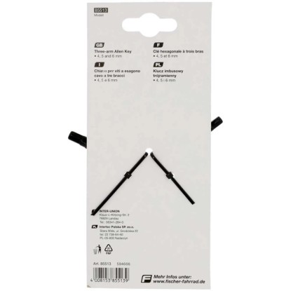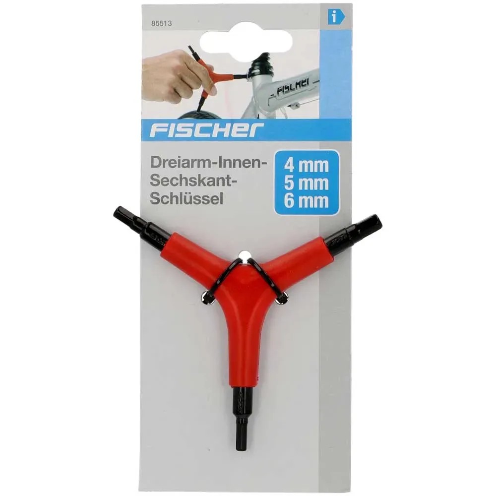Der Fischer Innensechskant-Schlüssel ist ein praktisches 3in1-Werkzeug für unterwegs. Er besteht aus gehärtetem Stahl und ist passend für die Grössen 4, 5 und 6 mm.