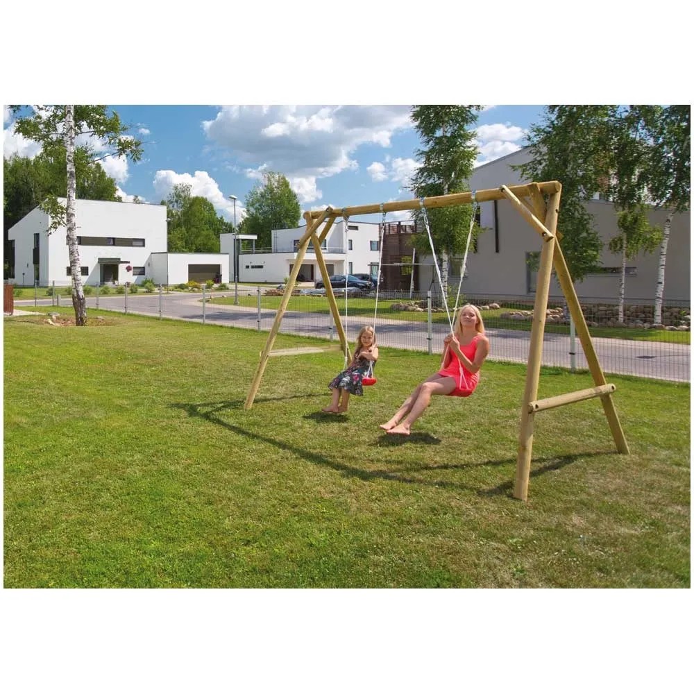 Die grün imprägnierte Pletscher Doppelschaukel Mathias erhalten Sie als Komplett-Bausatz. Im Lieferumfang sind 4 Schaukelschellen und 2 Kunststoff-Schaukelbretter enthalten. Der Schaukelbalken hat einen Durchmesser von 10 cm, die restlichen Rundhölzer sind 8 cm stark.