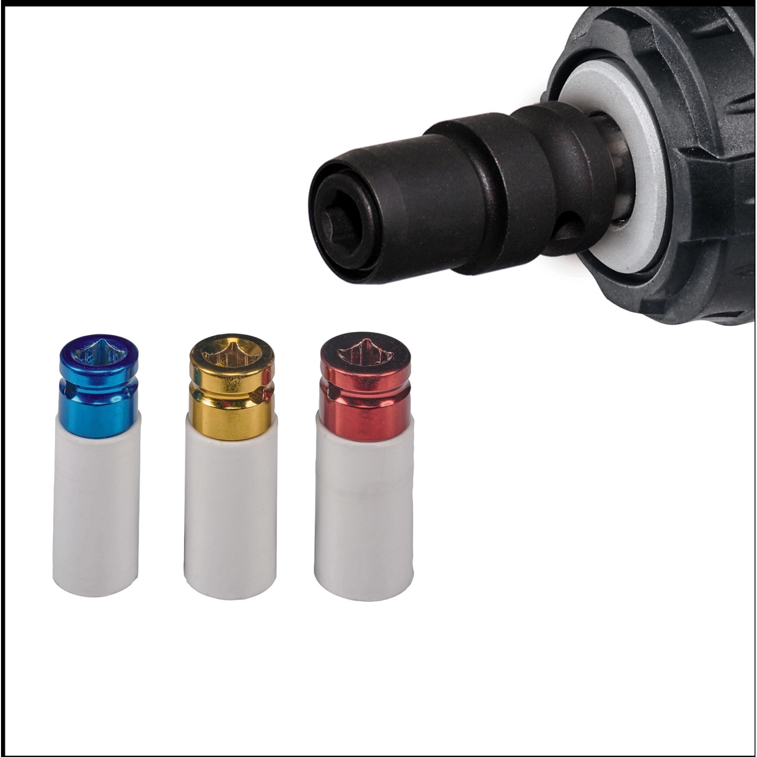 Im Lieferumfang befinden sich ein Bit-Adapter zum Schrauben und ein praktisches Nuss-Set für den Autoreifenwechsel inklusive.