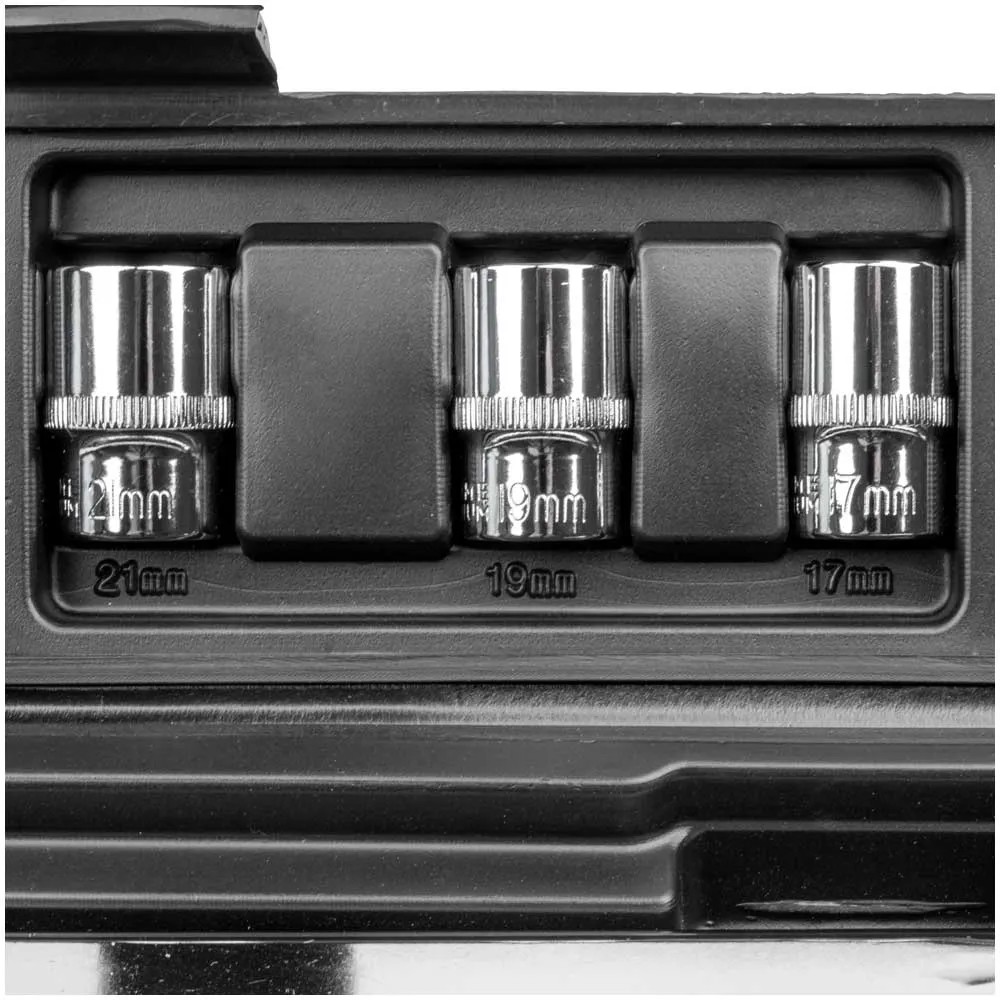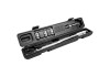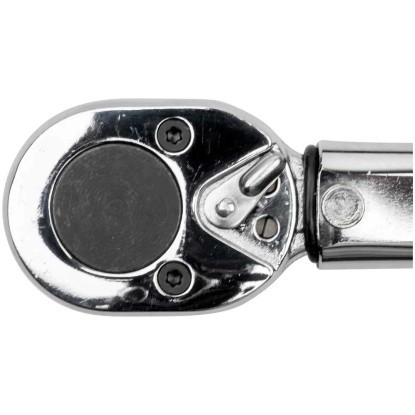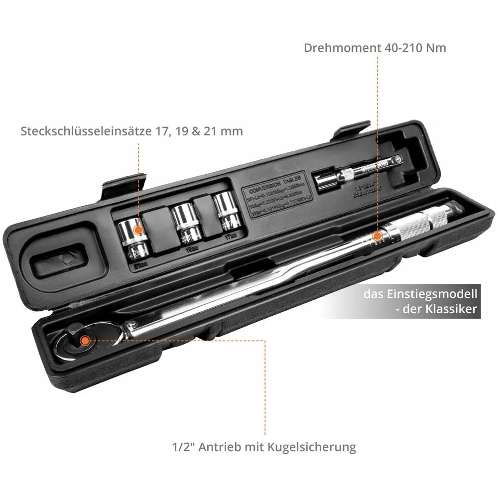Der Drehmomentschlüssel hat eine Länge von 470 mm und der Einstellbereich liegt bei 40 - 210 Nm. Die drei Steckschlüsseleinsätze sind aus hochwertigem Chrom-Vanadium-Stahl gefertigt. Diese verfügen, genau wie die Verlängerung, über eine Kugelsicherung.