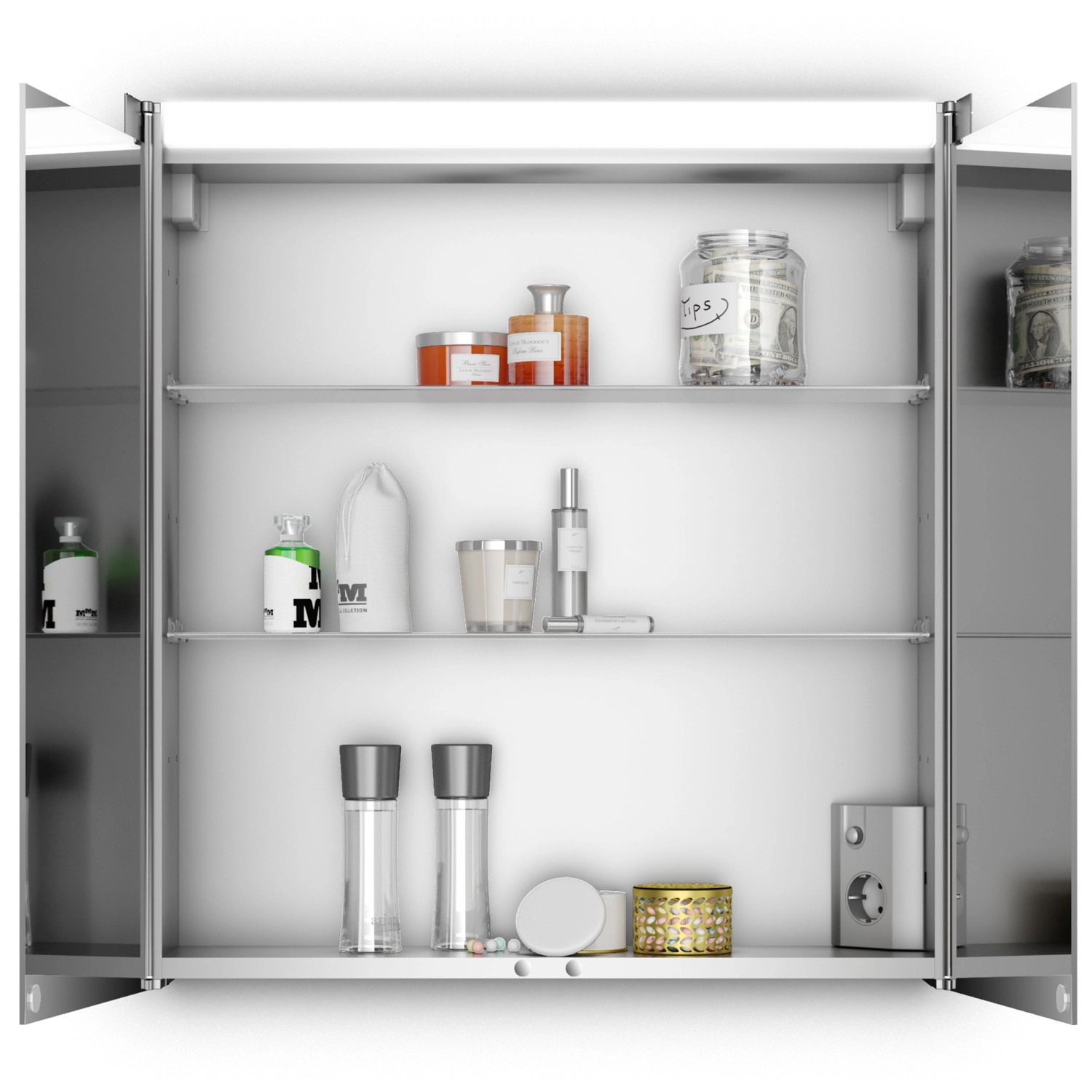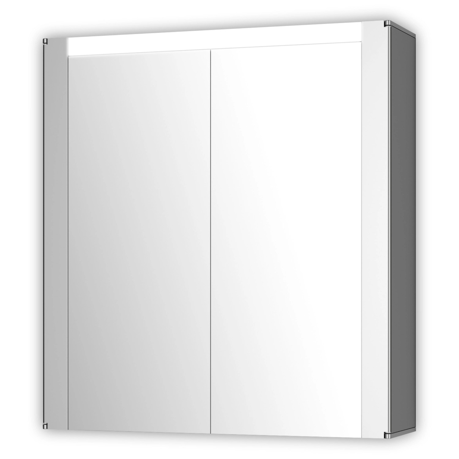 Der Spiegelschrank Tromsö aus MDF/Holz ist mit 2 Doppelspiegeltüren aus Kristallglas, einer Steckdose und einem Schalter ausgestattet. Die Glaseinlagen sind verstellbar.
