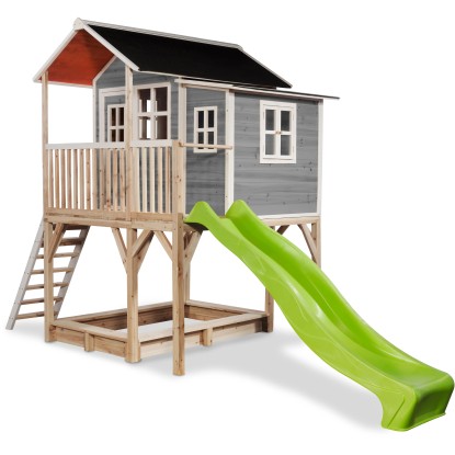 In dem Holzspielhaus Loft 750 brauchen sich Kinder keinen Tag zu langweilen. Dieses Holzspielhaus steht auf einer extra hohen Plattform und hat einen Anbau und eine lange Rutsche. Durch den höheren Rahmen können Kinder jeden Alters auch darunter in dem Sandkasten spielen. Die Kinder klettern einfach über die Treppe hoch und gleiten über die coole Rutsche nach unten. Die Spielhäuser sind dank der vormontierten Bestandteile einfach aufzubauen. Die Holzspielhäuser von Exit Toys sind aus FSC®-zertifiziertem Zedernholz (FSC® 100 %, FSC® SCS-COC-007799) hergestellt. Diese Holzart splittert nicht und ist von Natur aus beständig gegen Wettereinflüsse wie Regen und deshalb resistent gegen Verrottung. Das Spielhaus Loft 750 hat ein wasserdichtes Bitumendach, damit Kinder bei jedem Wetter damit spielen können. Die Holzspielhäuser von Exit müssen vor dem Gebrauch nicht behandelt werden.