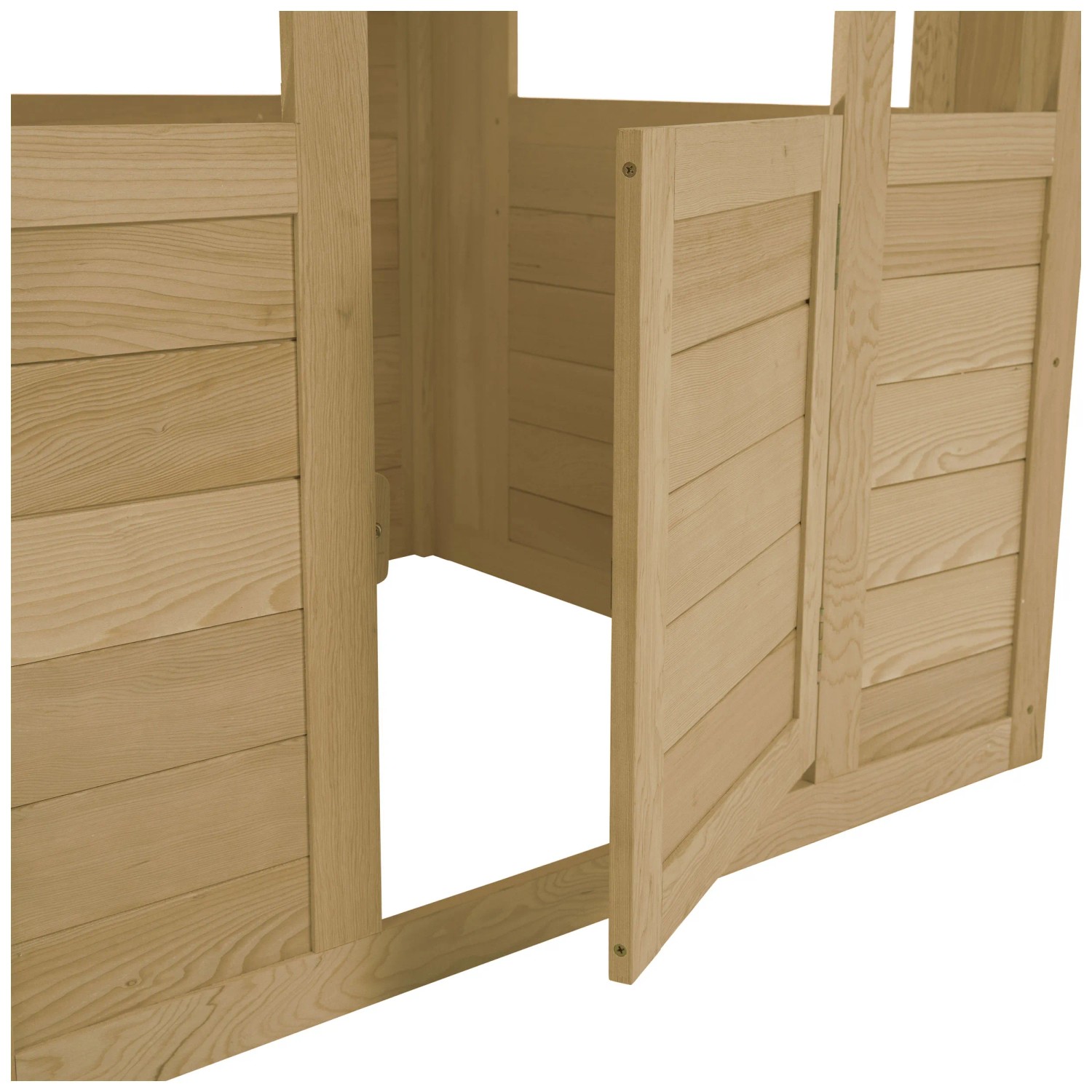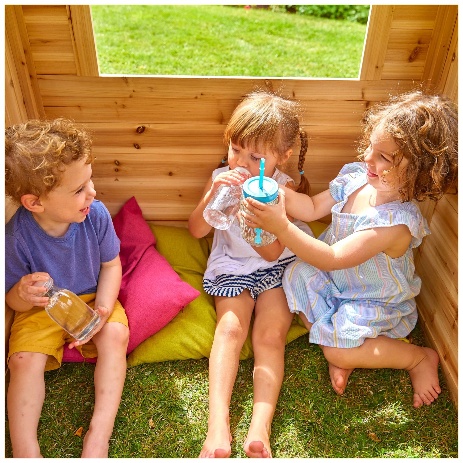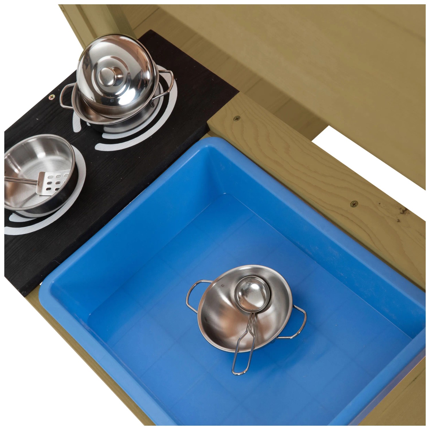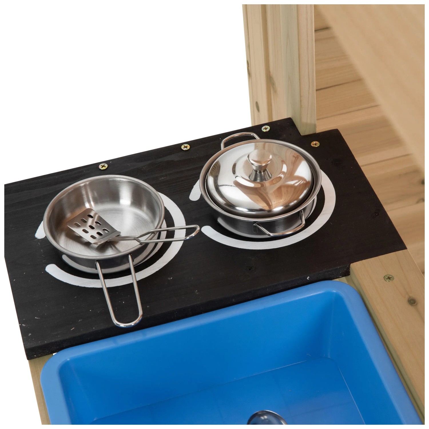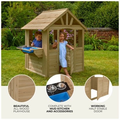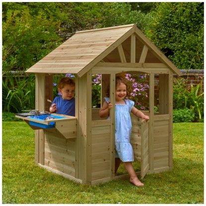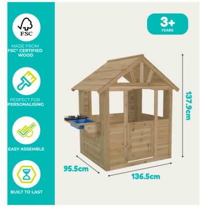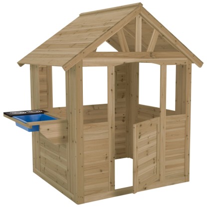 Das Spielhaus Cubby mit Spielküche ist aus robustem Tannenholz gefertigt und für Kinder von 3 bis 10 Jahren geeignet. Es bietet ein kindgerechtes Design mit Satteldach, hellem Innenraum durch offene Fenster und einer funktionierenden Halbtür. Die integrierte Spielküche ist mit Kochplatten, Spülbecken und Zubehör wie Töpfen und Pfannen ausgestattet. Der Holzboden ist im Lieferumfang enthalten, und die vorgebohrten Teile ermöglichen einen einfachen Aufbau. Das unbehandelte Holz kann individuell gestrichen werden. Das Spielhaus ist für den Gebrauch im Garten vorgesehen, enthält keine Batterien und ist nicht verschliessbar.