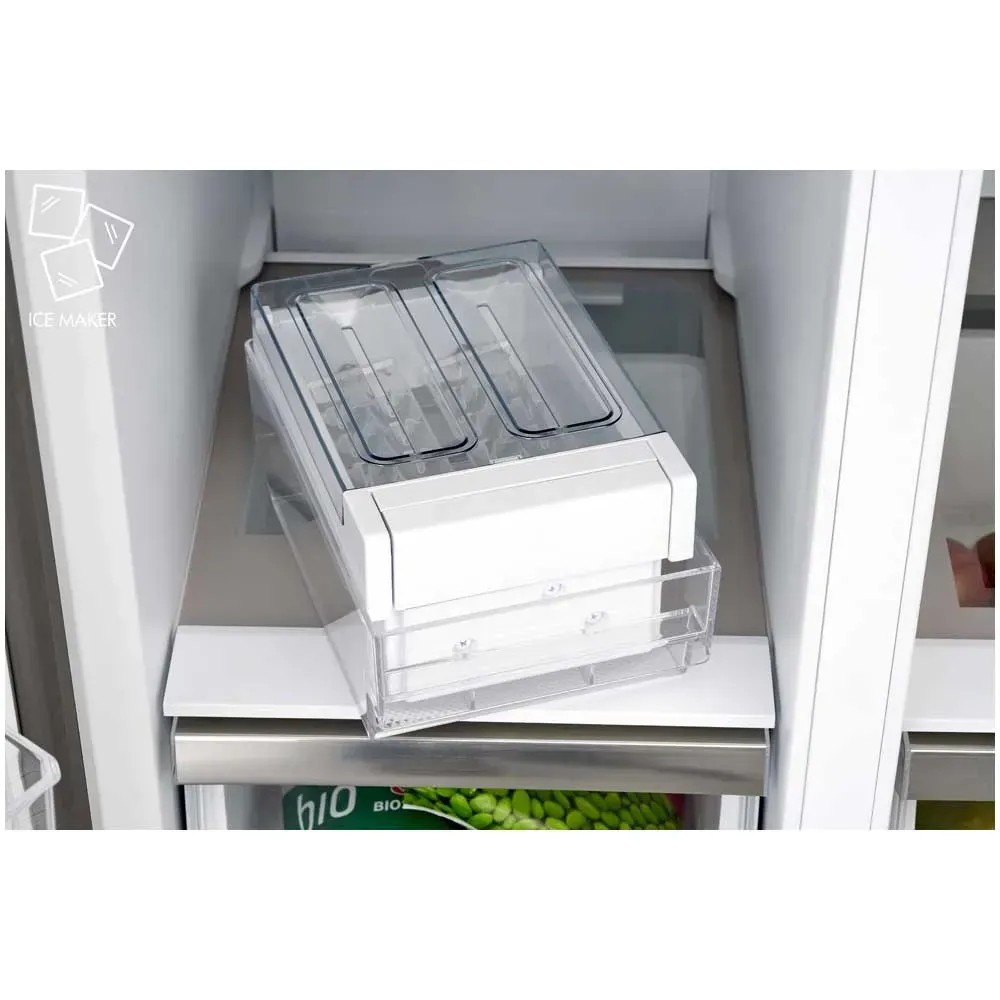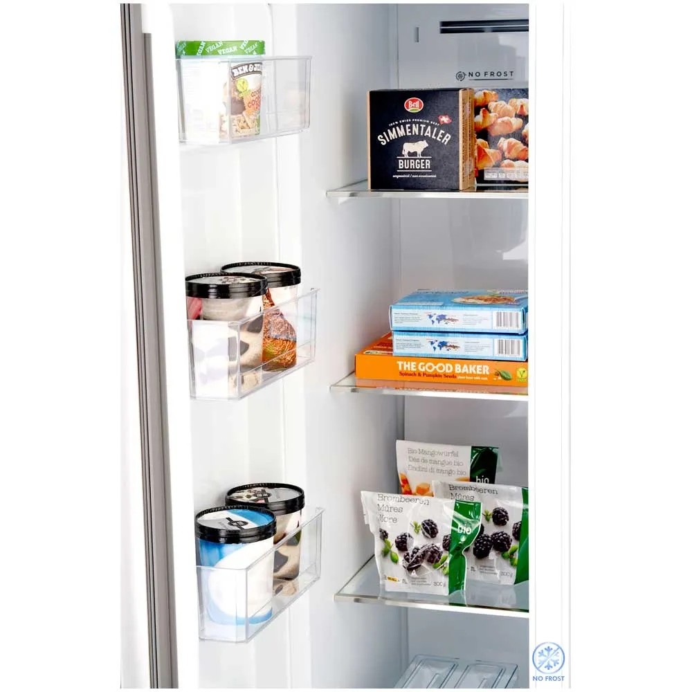 Der rechte Bereich bietet genug Platz für bis zu 379 l an Lebensmitteln, die bei +2 bis +8°C gekühlt werden sollten. Hier stehen vier Ablageflächen, zwei Schubladen sowie vier Türfächer zur Verfügung, in denen sogar 2-l-Flaschen mühelos stehend gelagert werden können. In den Schubladen herrschen zudem die optimalen Bedingungen zur Lagerung besonders empfindlicher Lebensmittel. In der praktischen und herausnehmbaren Halterung finden bis zu vier Getränkeflaschen Platz. Die linke Gefrierabteilung ist mit ihrer riesigen Kapazität von 213 l ein Segen für Freunde der Tiefkühlkost und grosse Haushalte. Zur Verfügung stehen auch hier drei Ablagefächer, zwei Schubladen und vier Türfächer, um das Gefriergut optimal einzuteilen. Mit dem mitgelieferten Eiswürfelspender lassen sich zudem Eiswürfel für den grösseren Bedarf herstellen.