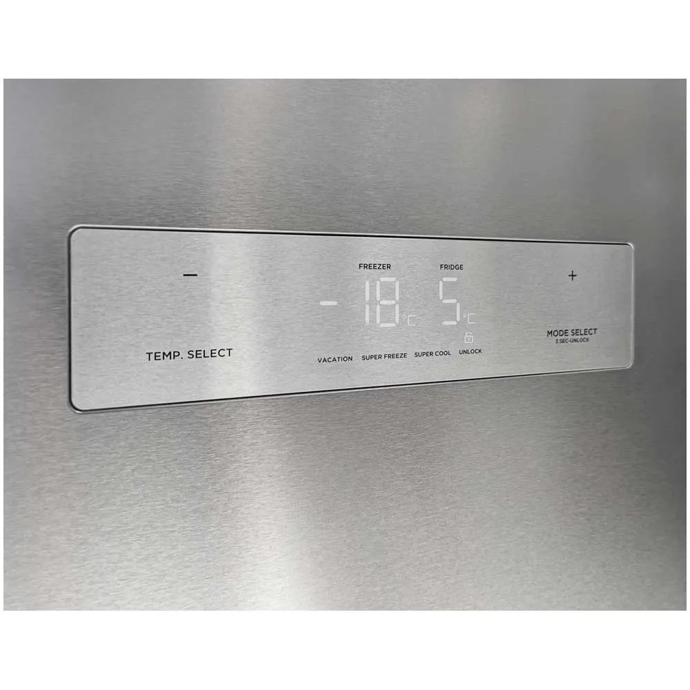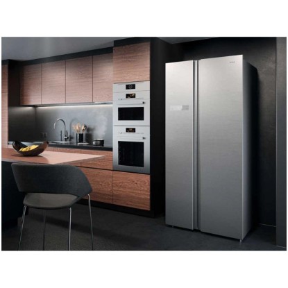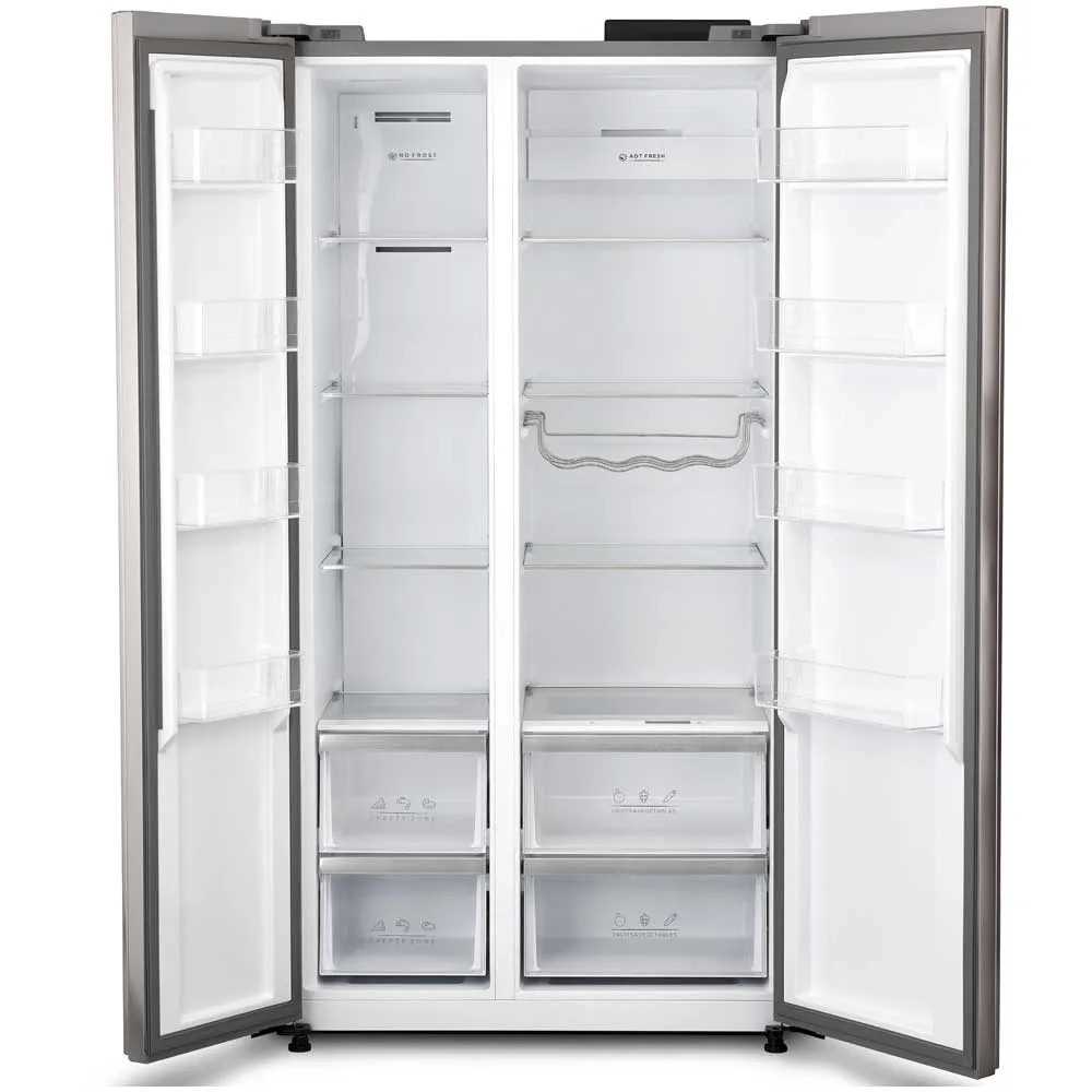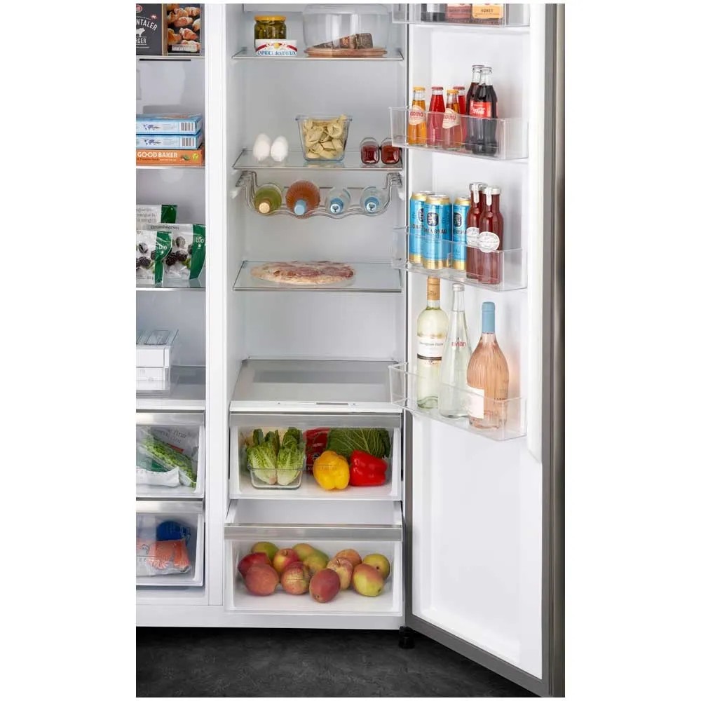 Der Kühlschrank Side-by-Side im modernen Design hat einen Kühlraum mit einem Fassungsvermögen von 379 l und eine Gefrierabteilung mit einem Fassungsvermögen von 213 l. Er verfügt über ein praktisches Bedienpanel an der Aussenseite für die manuelle Temperatursteuerung. Dank ADT-Design werden unangenehme Gerüche absorbiert und Lebensmittel länger frisch gehalten. Neben einem Fach für Obst und Gemüse gibt es auch ein Fisch- und Fleischfach für die optimale Lagerung. Die grossen Tablare haben eine integrierte Feuchtigkeitskontrolle. Der Inverterkompressor arbeitet leise und sehr effizient.