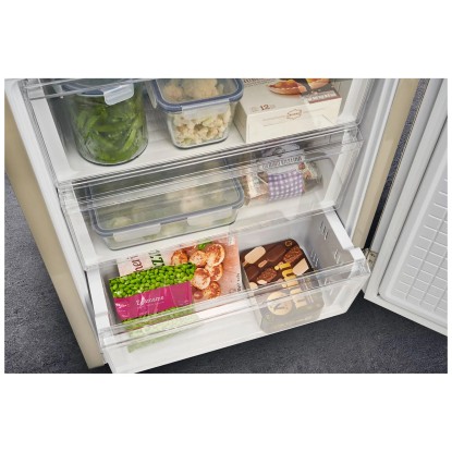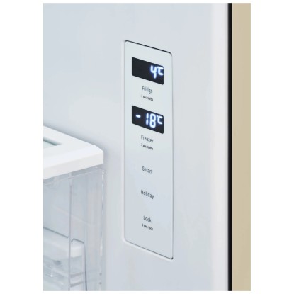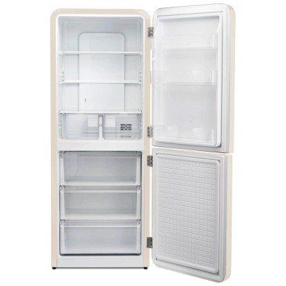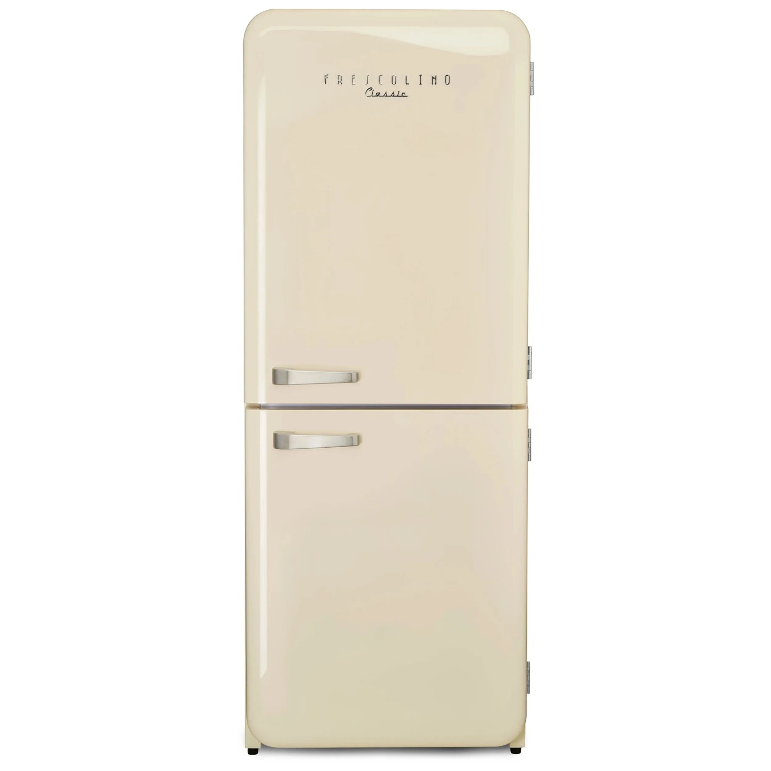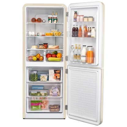 Der Retro-Kühlschrank Frescolino Classic von Trisa in Creme verbindet nostalgischen Stil mit moderner Technologie. Mit einer Gesamtkapazität von 401 Litern bietet er ausreichend Platz für Lebensmittel. Die Kühlabteilung fasst 250 Liter und der Gefrierteil 151 Liter. Verchromte Griffe und abgerundete Kanten unterstreichen das elegante Retro-Design. Die No-Frost-Technologie verhindert Eisbildung und die Super-Cool- sowie Super-Freeze-Modi sorgen für schnelle Temperaturanpassung. Ein LED-Display ermöglicht eine unabhängige Temperaturregelung. Der freistehende Kühlschrank ist mit einem Display ausgestattet und bietet mit mehreren Schubladen vielseitige Stauraummöglichkeiten für die moderne Küche.