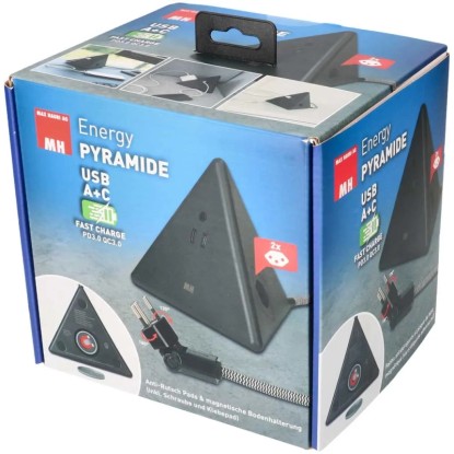 Die formschöne Energy Pyramide ist die ideale Steckdosenleiste zur Stromversorgung auf Schreibtisch oder Sofa. Sie verfügt über ein leistungsfähiges USB-A+C-Schnell-Ladegerät sowie zwei seitliche Steckdosen Typ13. Der integrierte Magnet sorgt für einen sicheren Stand auf allen magnetischen Materialien. Die Anti-Rutsch-Pads bieten einen sicheren Stand und sorgen für einen schonenden Umgang auf allen Oberflächen. Die beigelegte magnetische Bodenhalterung zum Kleben oder Schrauben ermöglicht die Platzierung der Pyramide auch an nicht magnetischen Orten. So ist trotzdem eine magnetische Befestigung möglich.