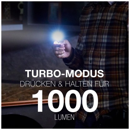 Das helle Licht der High Lumen Hybrid reicht ca. 49 m weit. Im Betriebsmodus High beträgt die Laufzeit mehr als 4 h. Wenn Sie eine aussergewöhnliche Lichtleistung benötigen, schalten Sie einfach in den Turbomodus. Er liefert Ihnen mit seinen 1'000 l eine besonders starke Ausleuchtung.